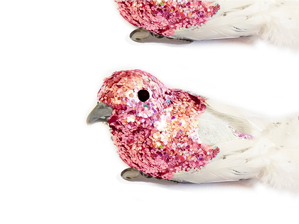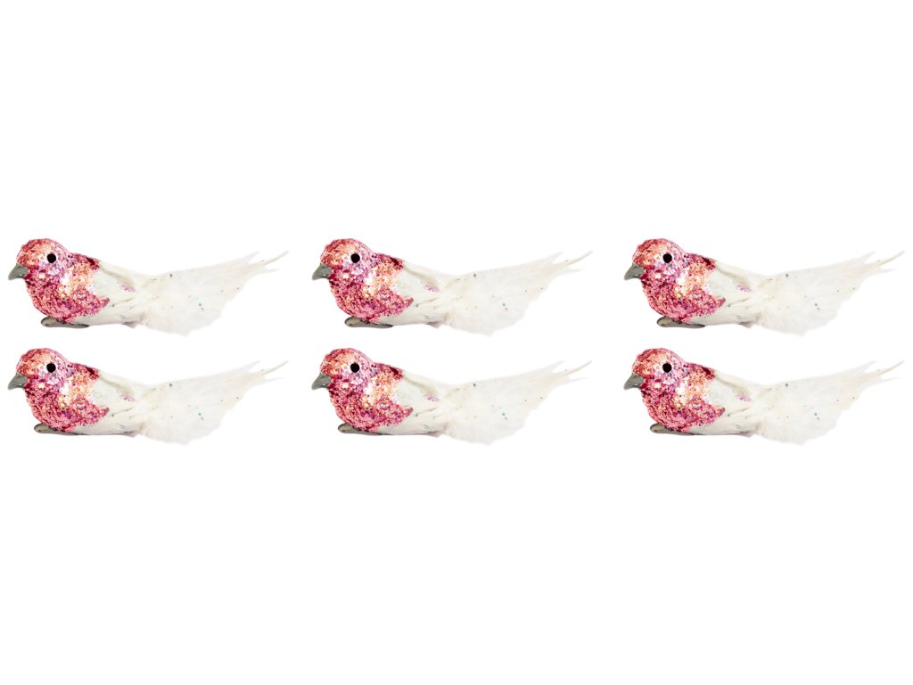 Sada 6 kusů ozdob v podobě ptáčků s bílým peřím a růžovými glitery.