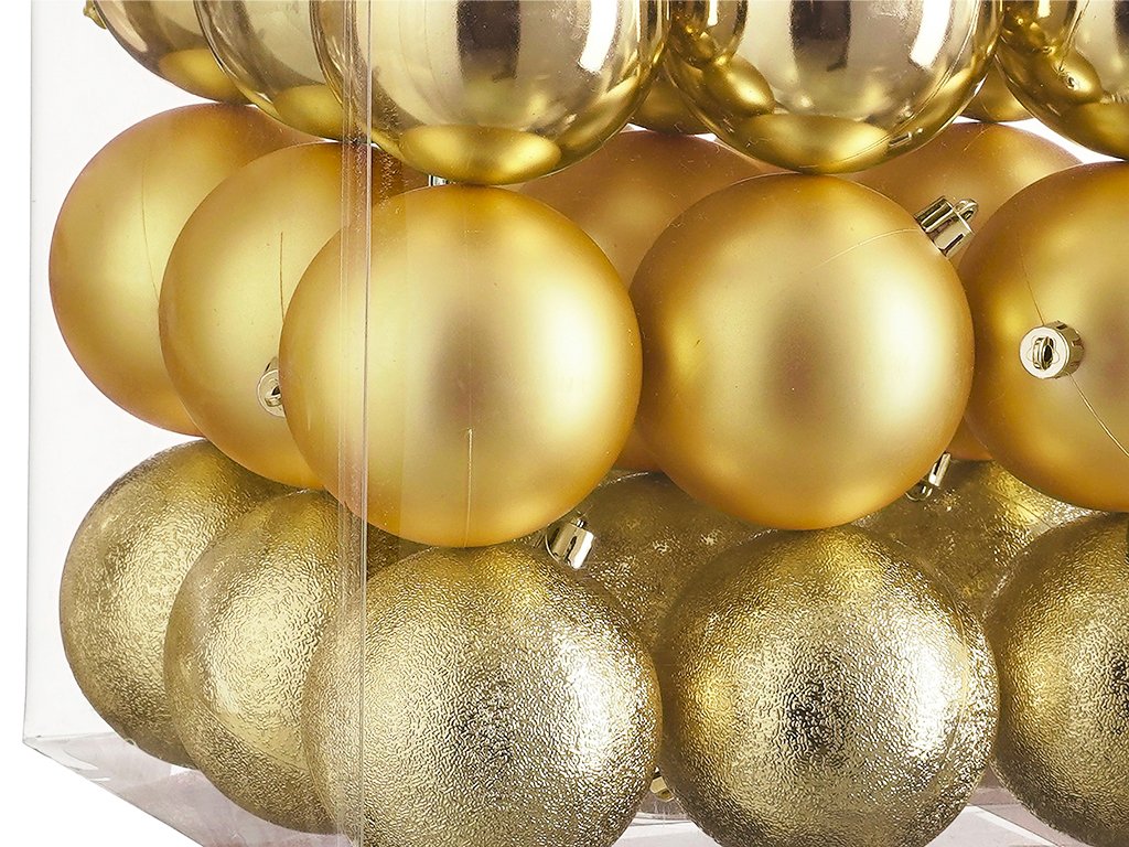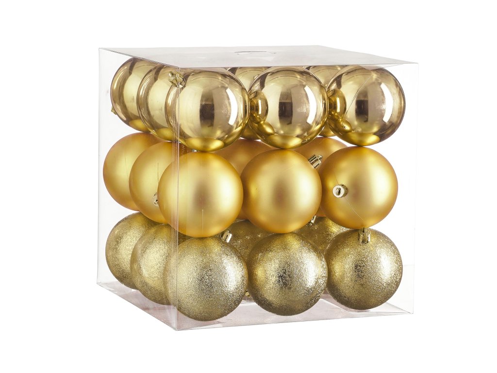 Sada 27 ks plastových ozdob ve zlaté barvě v lesklém, matném a dekorovaném provedení.