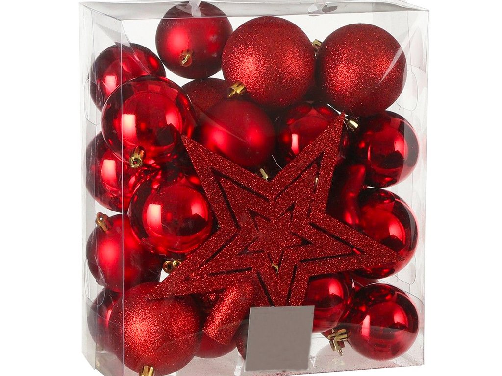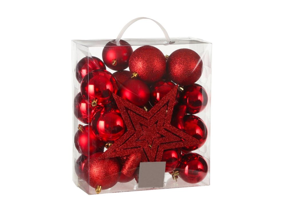 Sada 40 ks ozdob obsahuje mix ozdob v červené barvě v lesklém, matném provedení a s glitry.