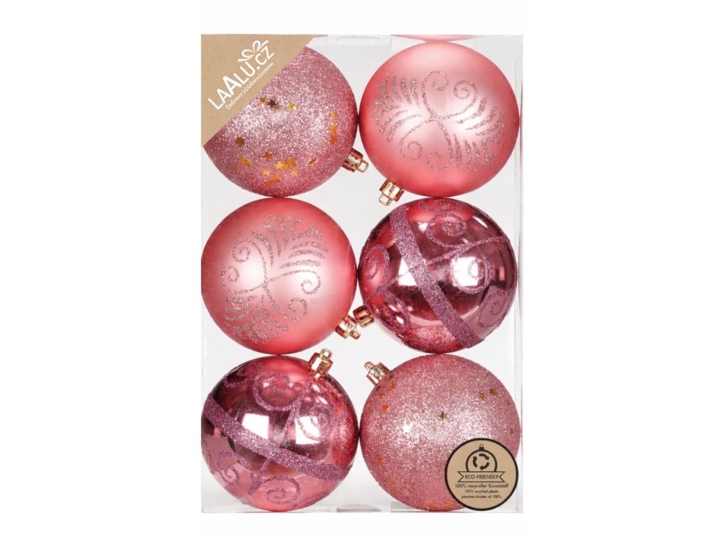 Sada 6 vánočních ozdob v růžovo-červeném odstínu s jemným třpytivým a dekorativním zdobením.