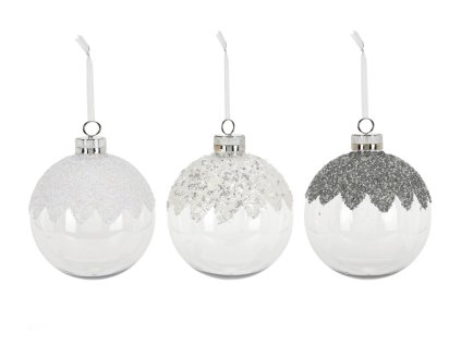 V této sadě najdete několik druhů ozdob, od jednoduchých stříbrných matných i lesklých, přes třpytivé až po baňky, které jsou kombinací obou barev.