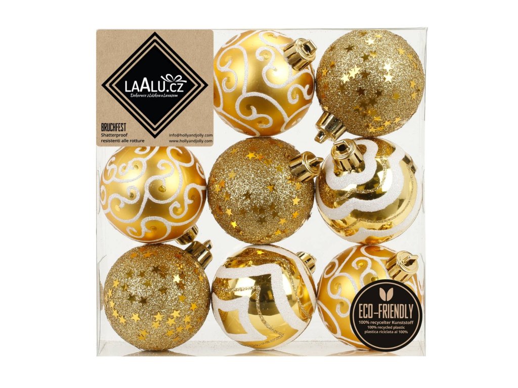 Sada 9 kusů kulatých ozdob v jednotném zlatém odstínu přináší kombinaci různých povrchových úprav v jednom balení.