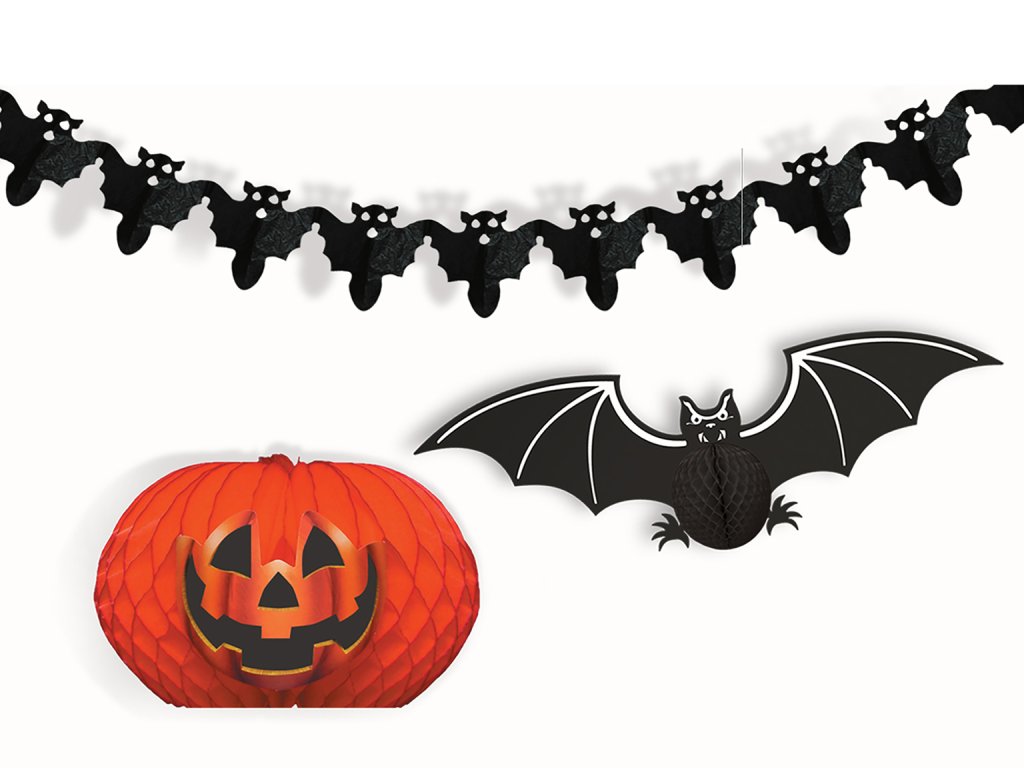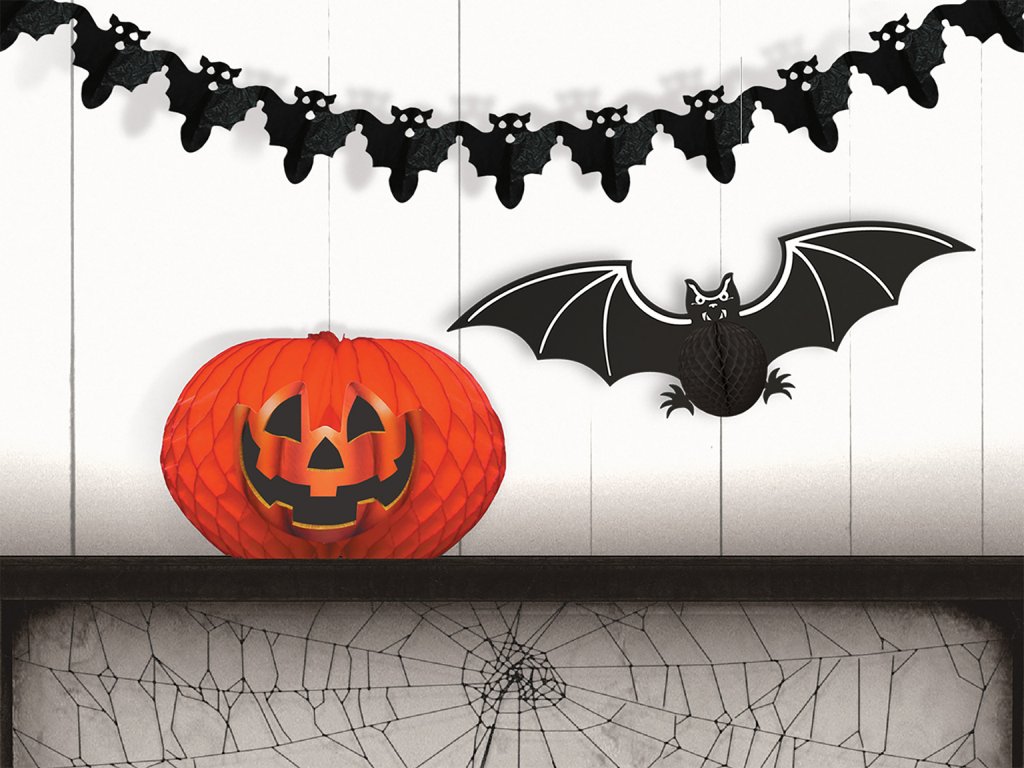 Sadu dekorací tvoří dlouhý řetěz s netopýry a papírová dekorace velkého netopýra.