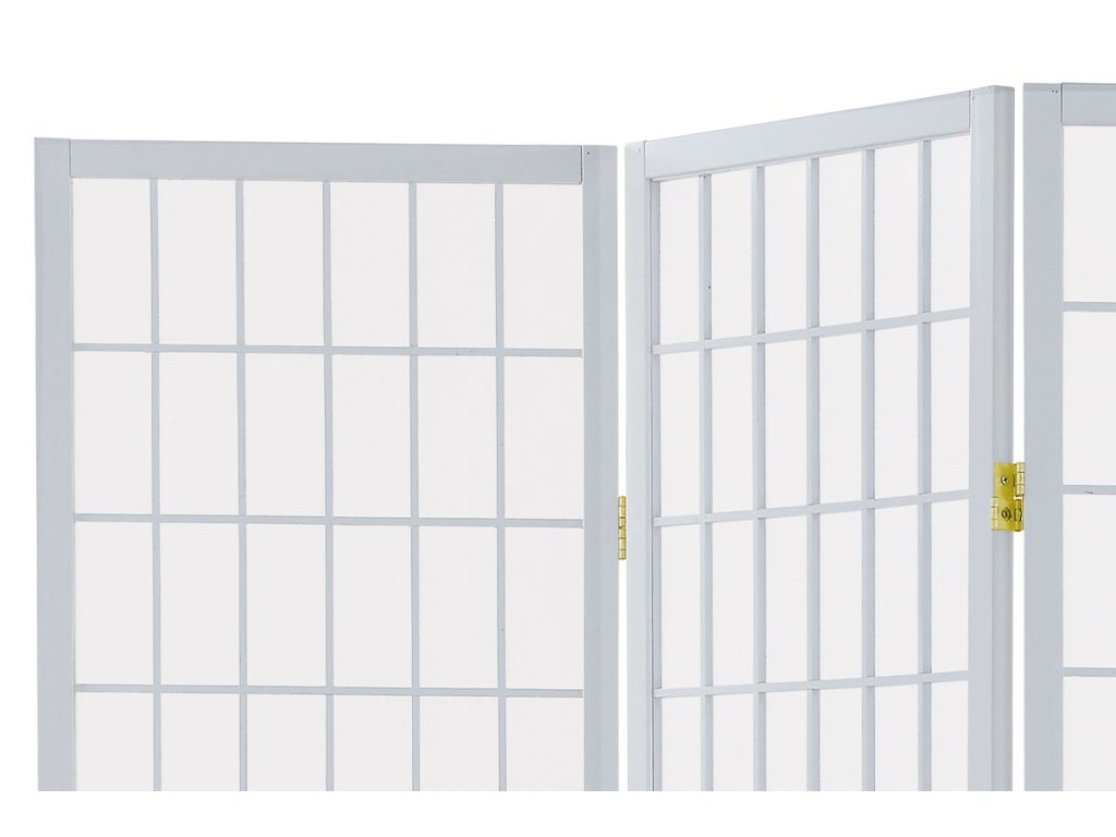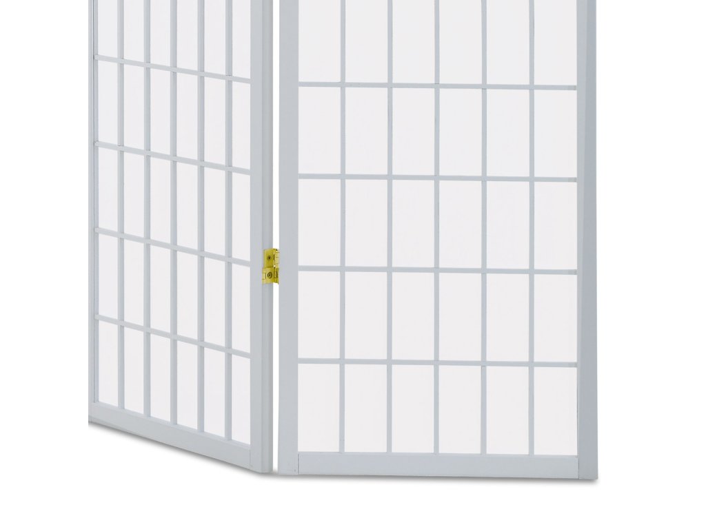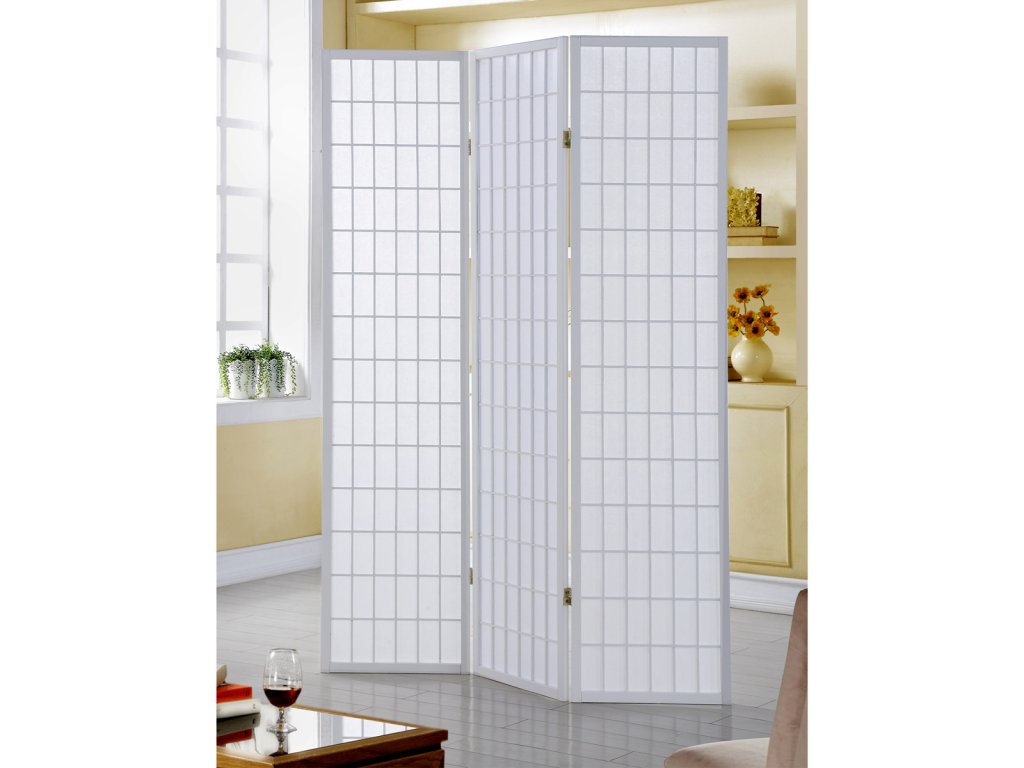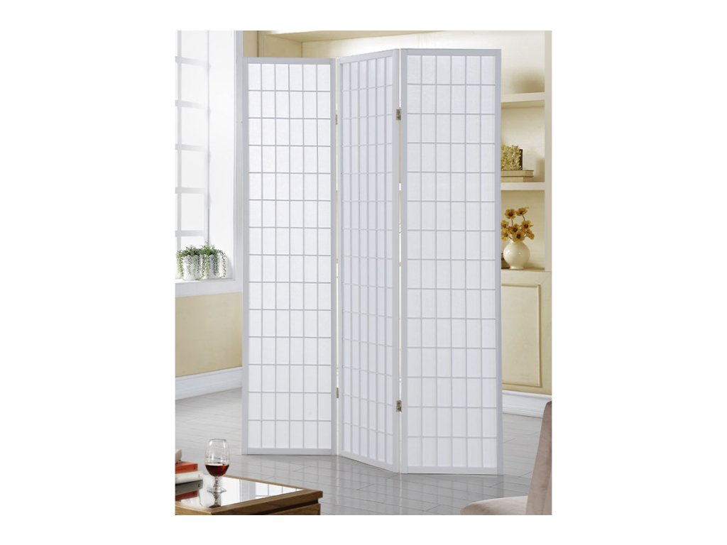 Moderní 3dílný paravan s dřevěnou konstrukcí z masivního smrku v bílé barvě, a výplní z netkané textilie.