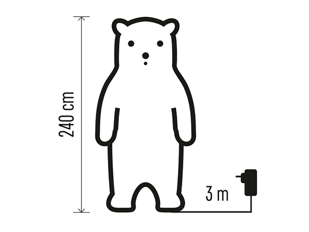 Medvěd je vysoký 2,4 m a má přívodní kabel o délce 3 m.