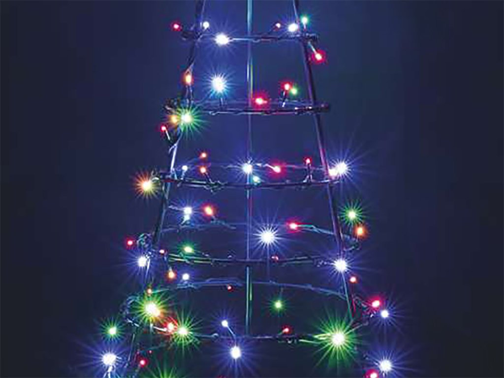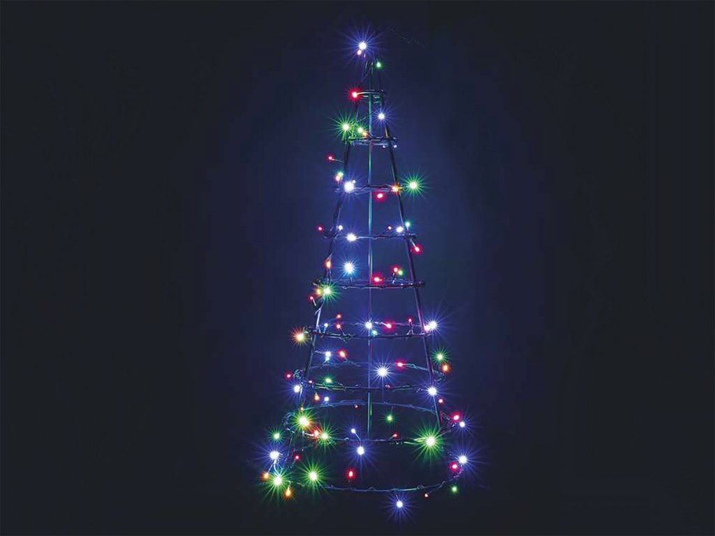 Stromeček je vyroben z kvalitní kovové konstrukce, na které je připevněn barevný světelný řetěz s ochranou IP44 - vhodné pro vnitřní i venkovní použití.