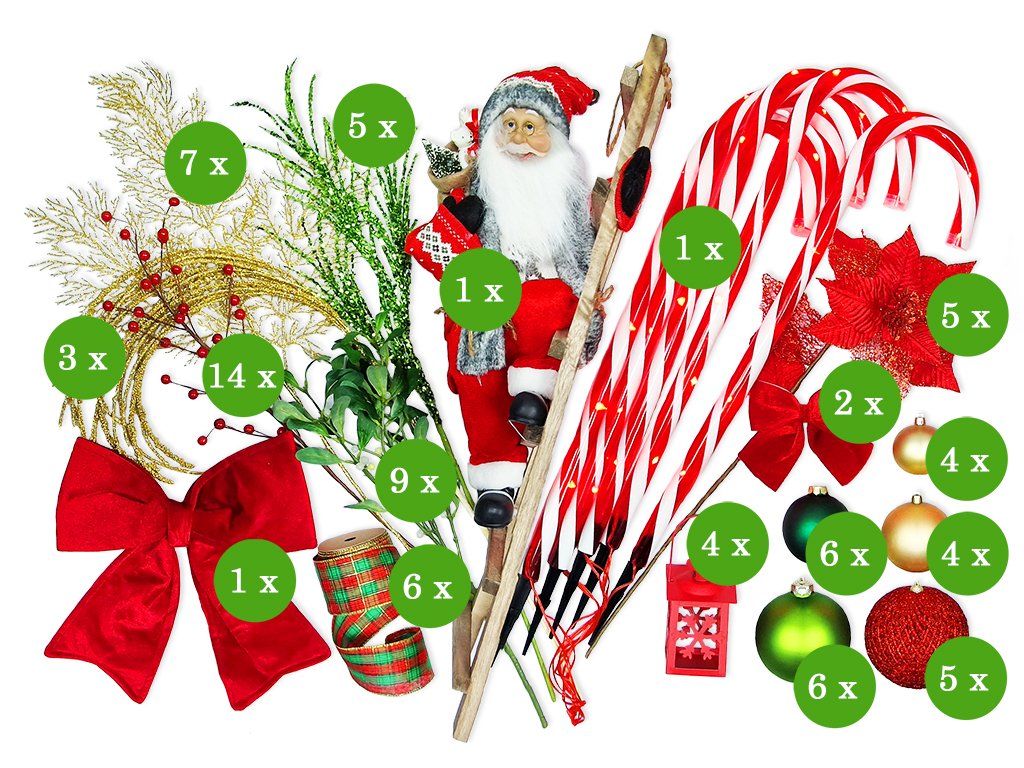 Obsahuje pestrou paletu vánočních symbolů a dekorací např.: dekorační větvičky, stuhy, světelné cukrové hůlky.