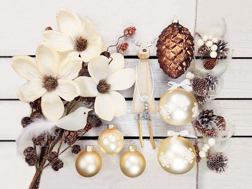 V hlavní roli jsou květiny vánočních magnolií, soby a maxi skleněné šišky.
