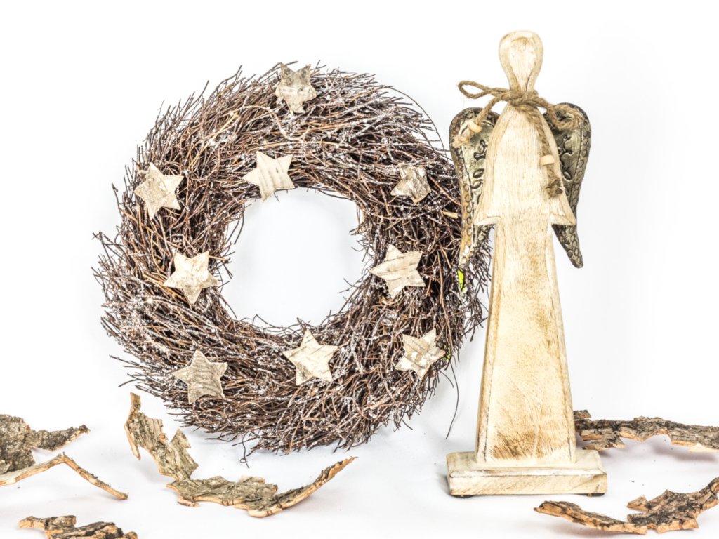 ZAPŮJČENÍ - Sada 2 ks dekorací: Anděl dřevěný s mašličkou, věnec s hvězdičkami
