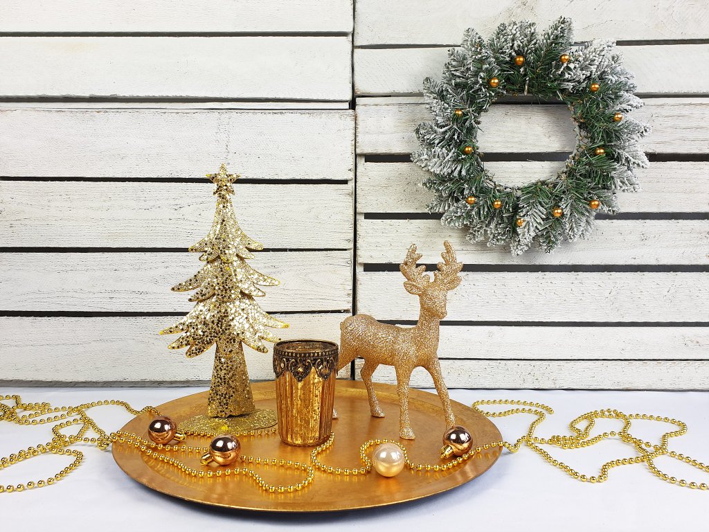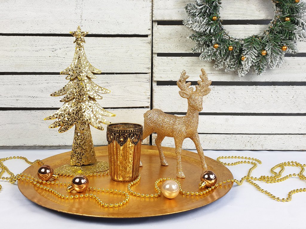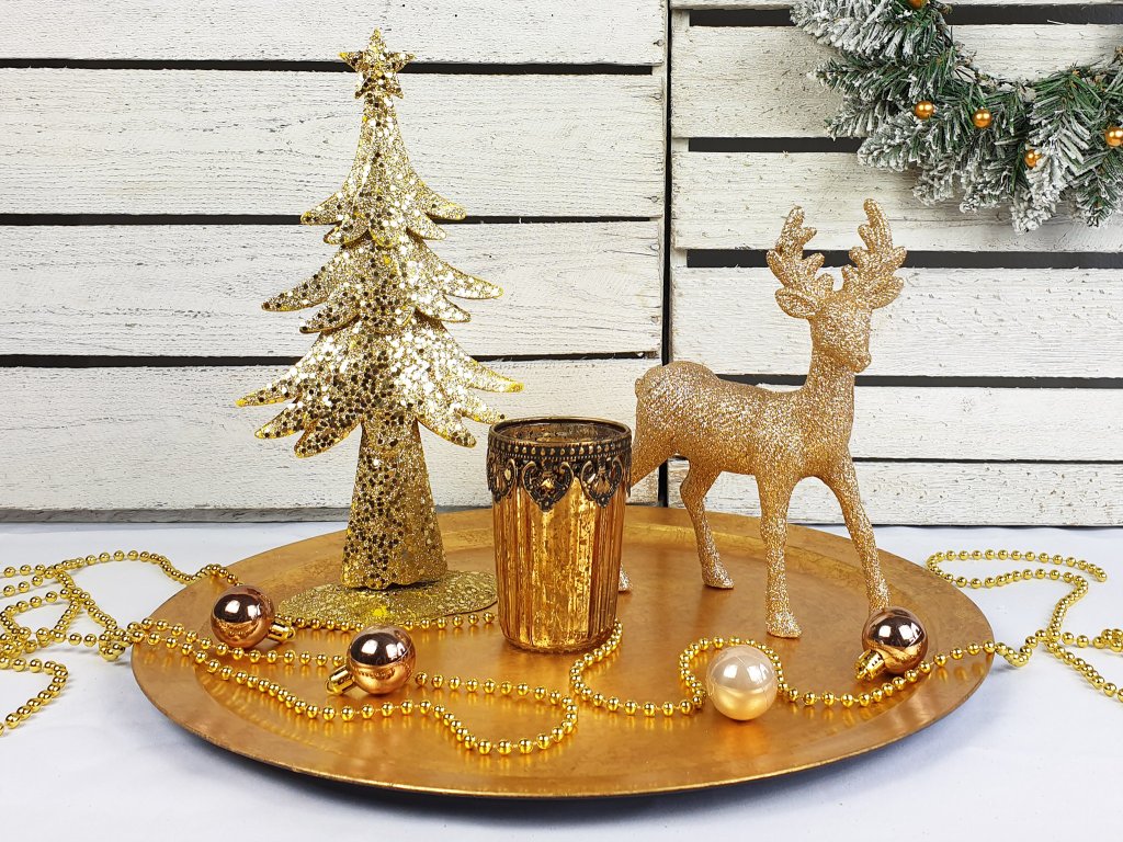 Třpytivé dekorace v podobě svícnu, stromečku a jelínka podtrhuje zlatý tác.