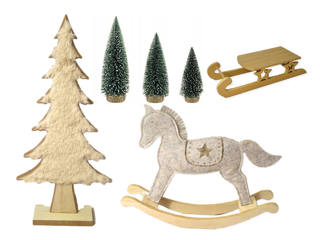 ZAPŮJČENÍ - Sada 6 ks dekorací: Vánoční stromky, houpací koník a sáňky