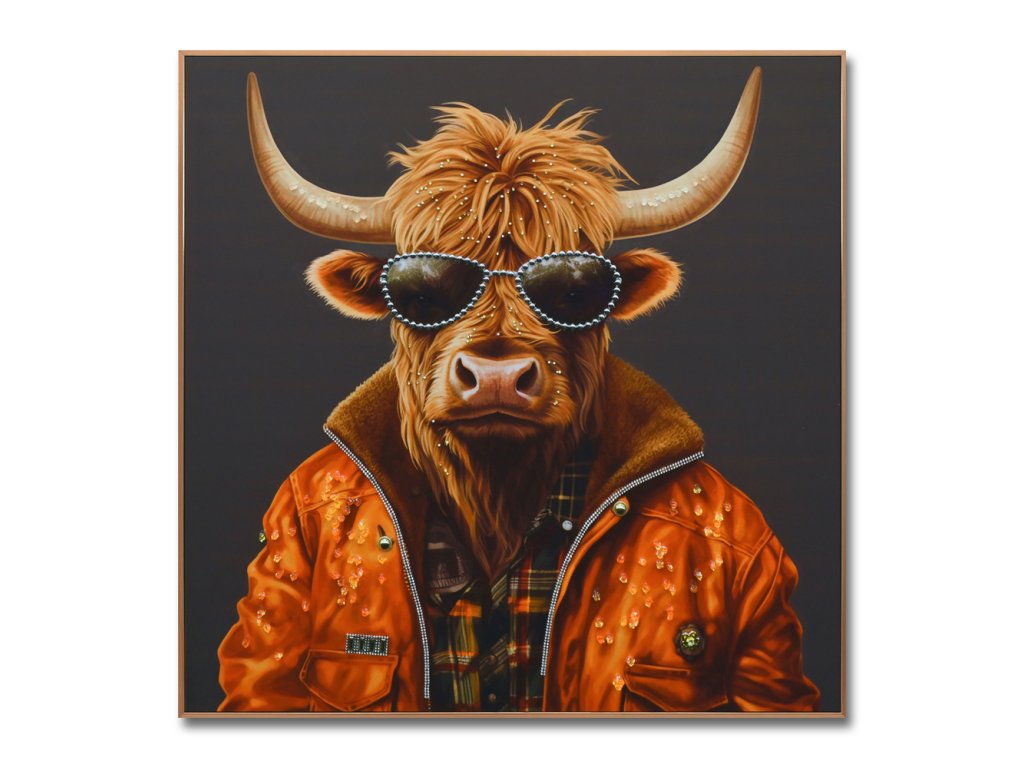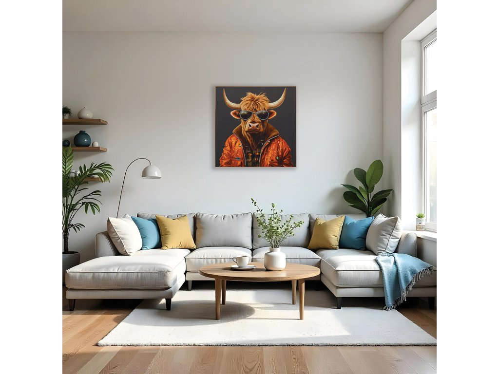 Zábavný, extravagantní a naprosto nepřehlédnutelný – takový je lakovaný obraz „Cool Highland“, který přetváří tradiční motiv skotského býka v moderní pop-artový portrét.