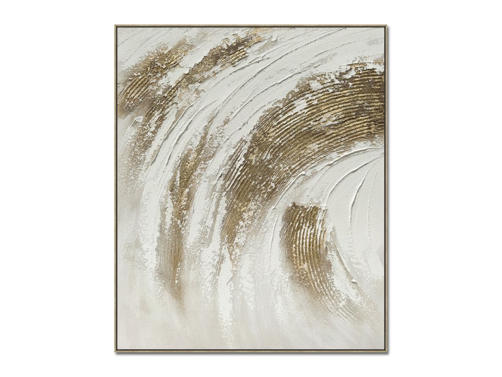 Malířské plátno je napnuté na masivní dřevěný rám a navíc vsazené do moderního zlatého plastového rámu.