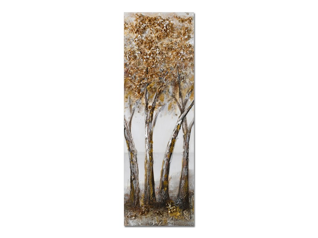 Tento ručně malovaný obraz zachycuje motiv kmenů a korun stromů v teplých přírodních tónech, a to s výraznou texturou a osobitou hloubkou.