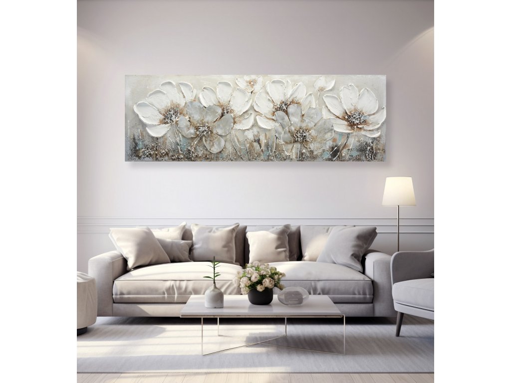 Tento ručně malovaný obraz na plátně v jemných béžových, hnědých, bílých a lehce stříbrných odstínech zachycuje krásu rozkvetlých květů v jejich rozkvetlé podobě.