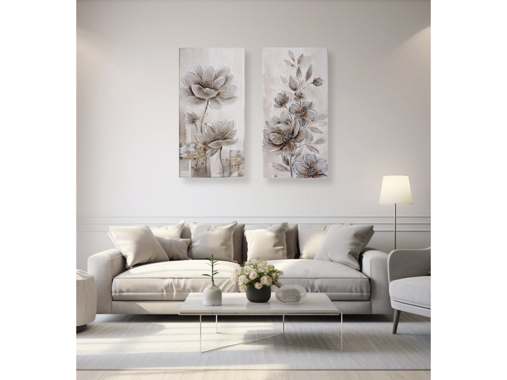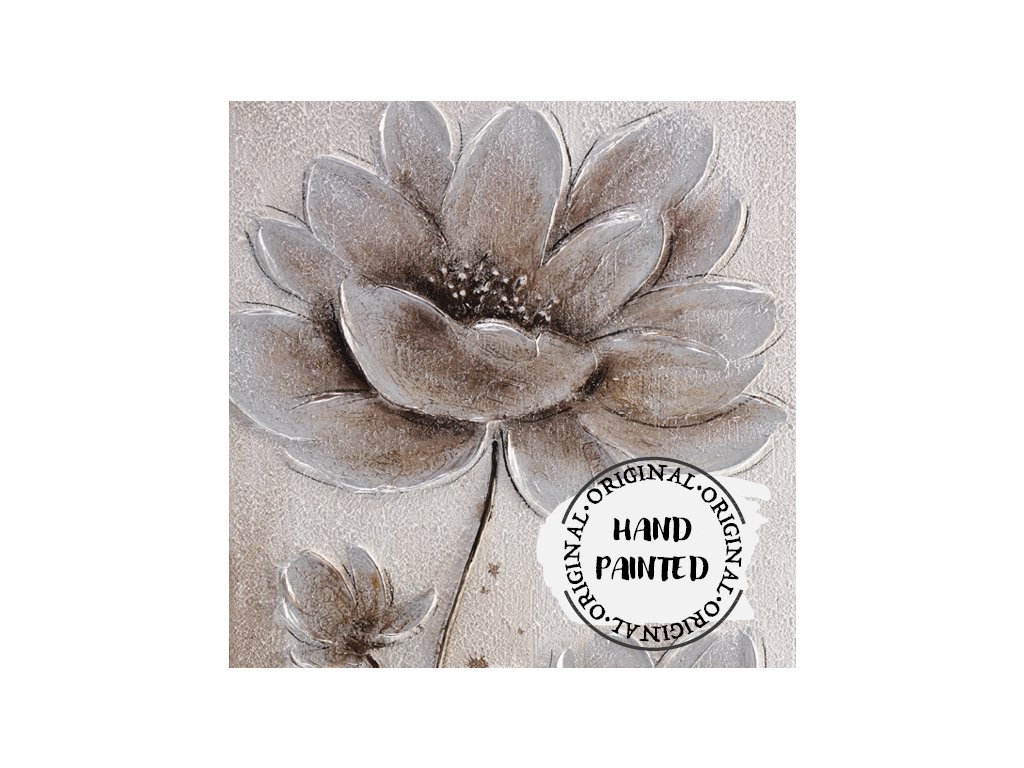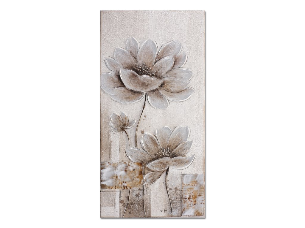 Tento ručně malovaný obraz na plátně v jemných béžových, bílých a lehce stříbrných odstínech zachycuje krásu rozkvetlých květů v jejich rozkvetlé podobě.