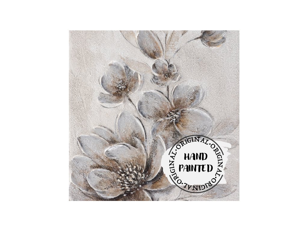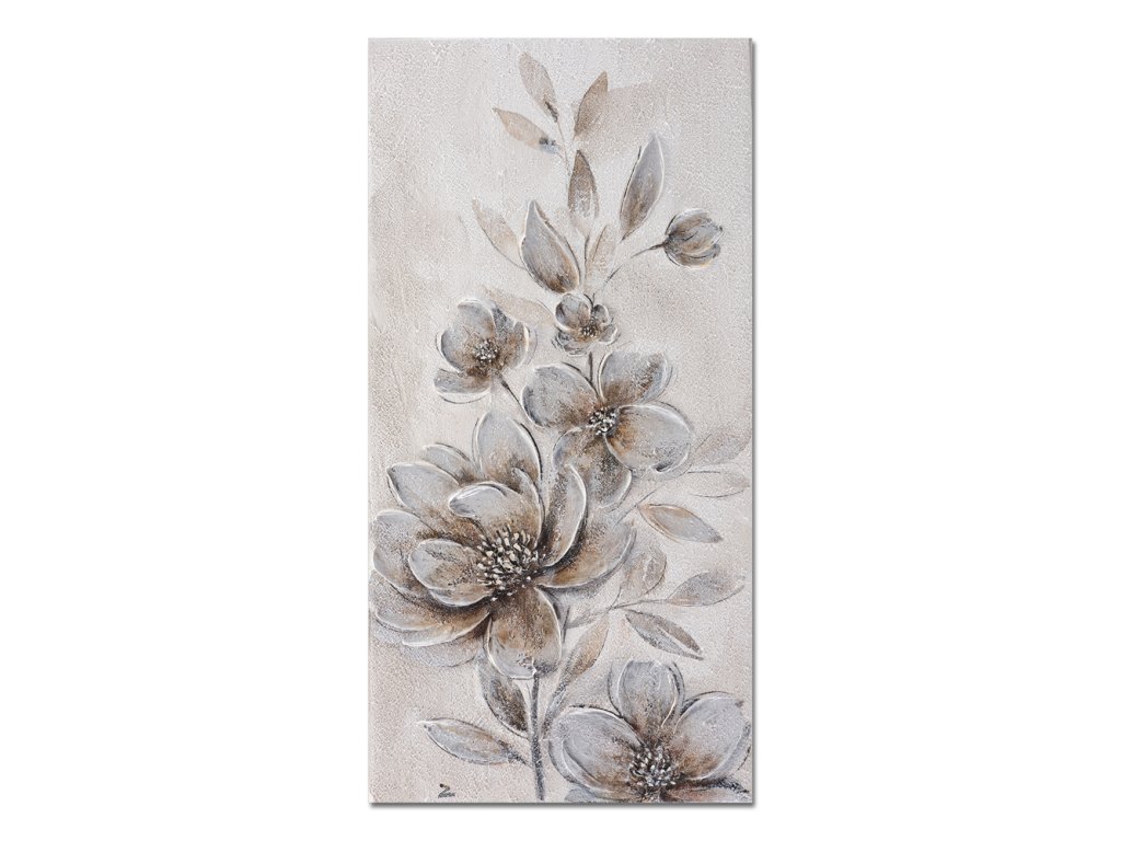 Tento ručně malovaný obraz na plátně v jemných béžových, hnědých, bílých a lehce stříbrných odstínech zachycuje krásu rozkvetlých květů v jejich rozkvetlé podobě.