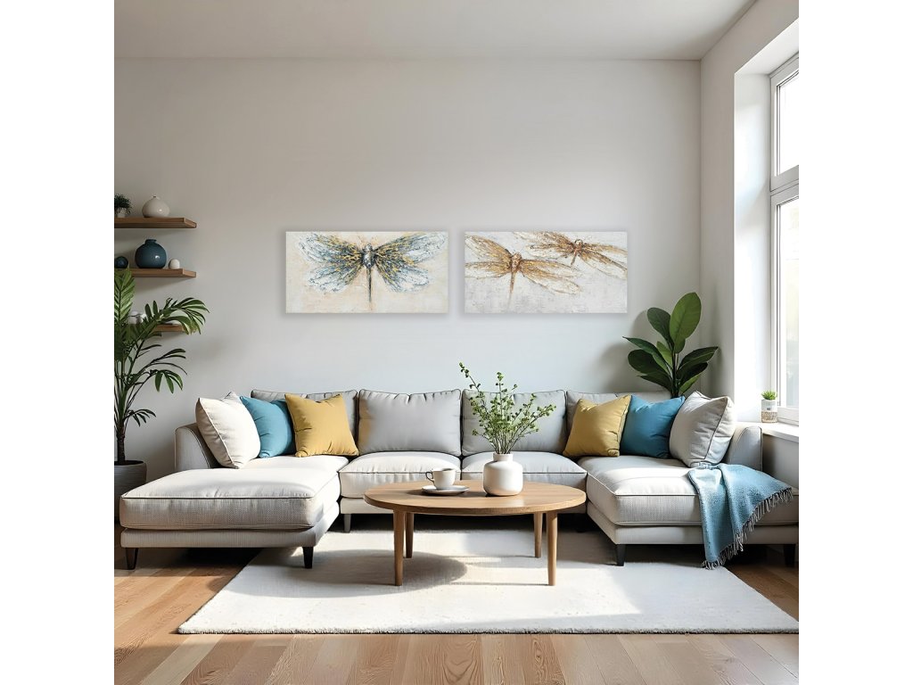 Tento působivý ručně malovaný obraz zachycuje dvě vážky v ladném pohybu, ztvárněné výraznou strukturální technikou s 3D efektem.