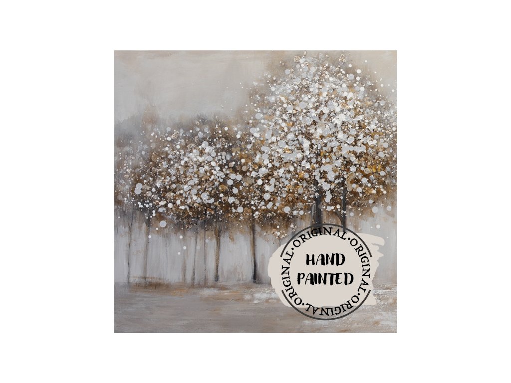 Tento ručně malovaný obraz na plátně zachycuje abstraktní ztvárnění stromů, kde se mísí teplé tóny hnědé, béžové a bílé.