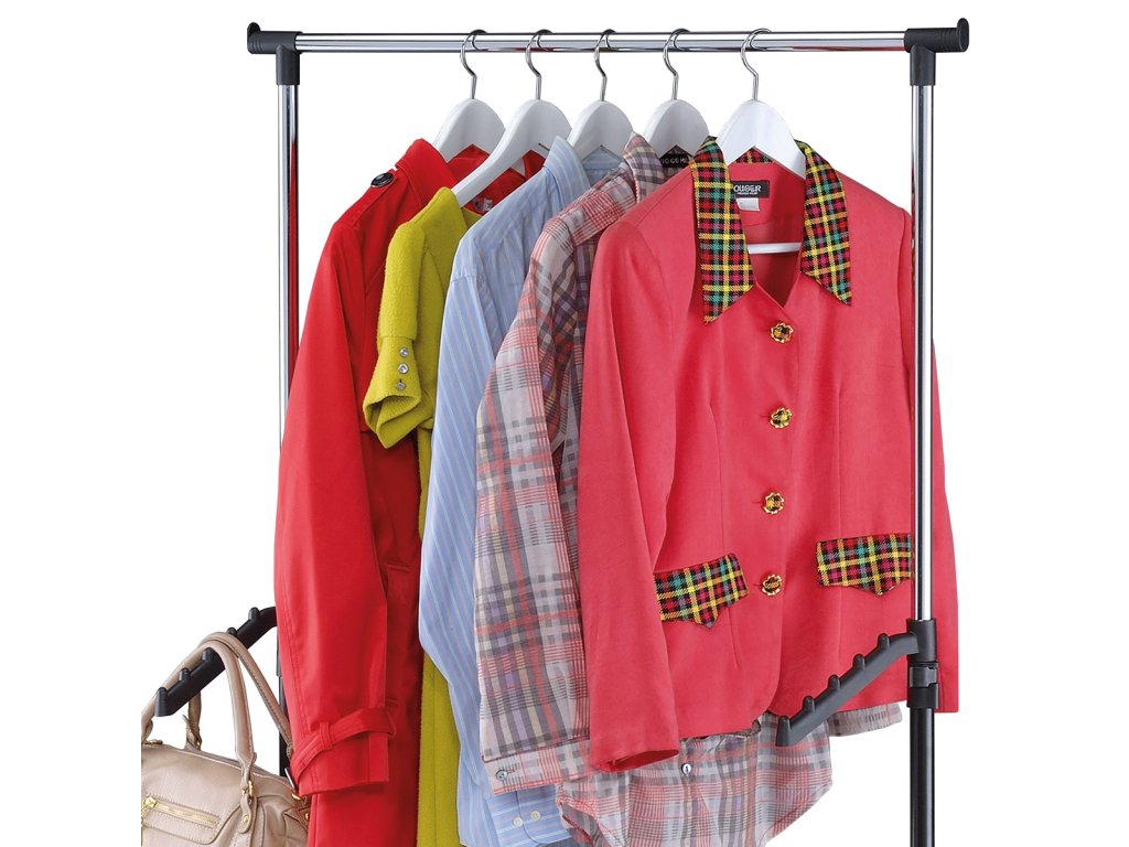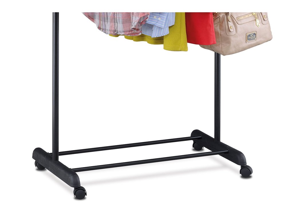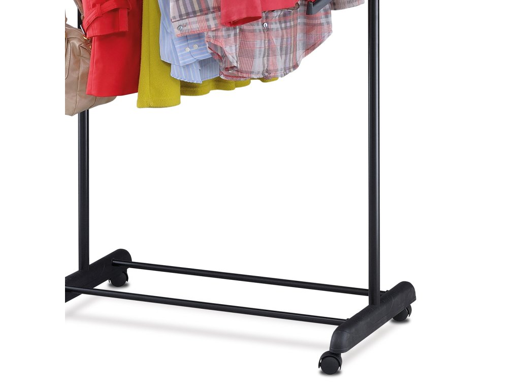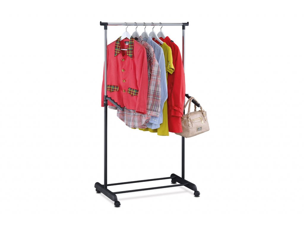 Stojan na šaty v černé barvě v kombinaci kovu, plastu a chromu.