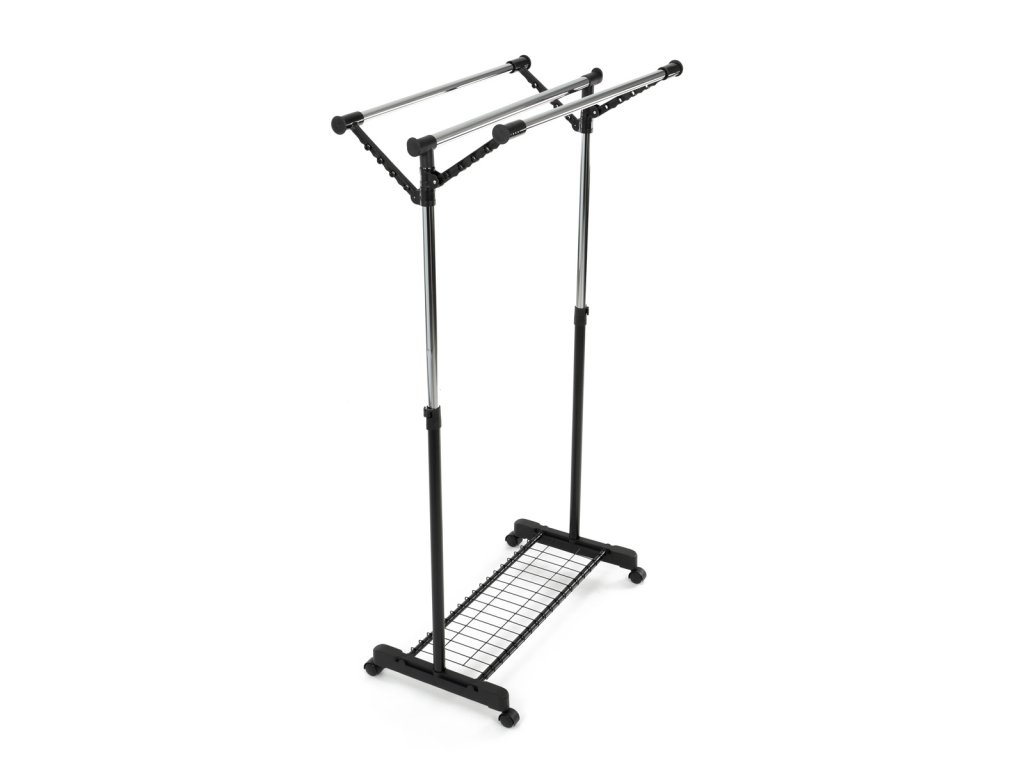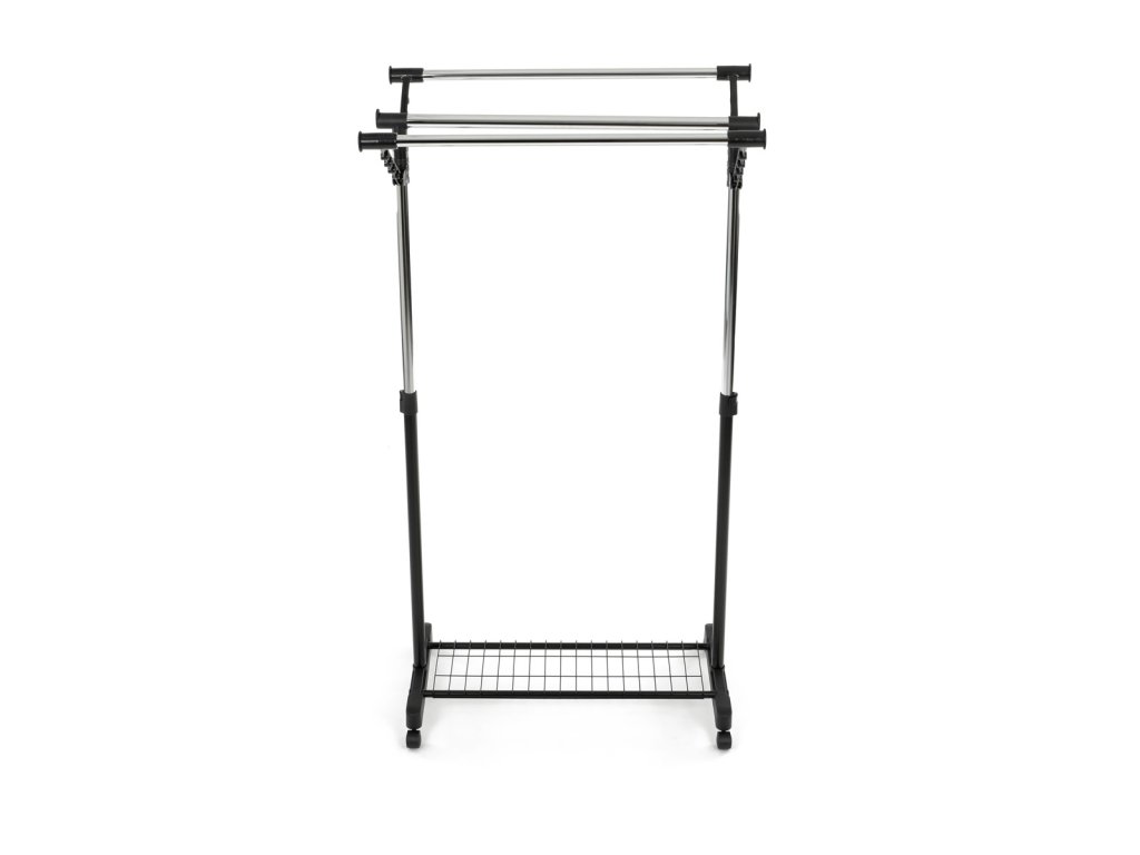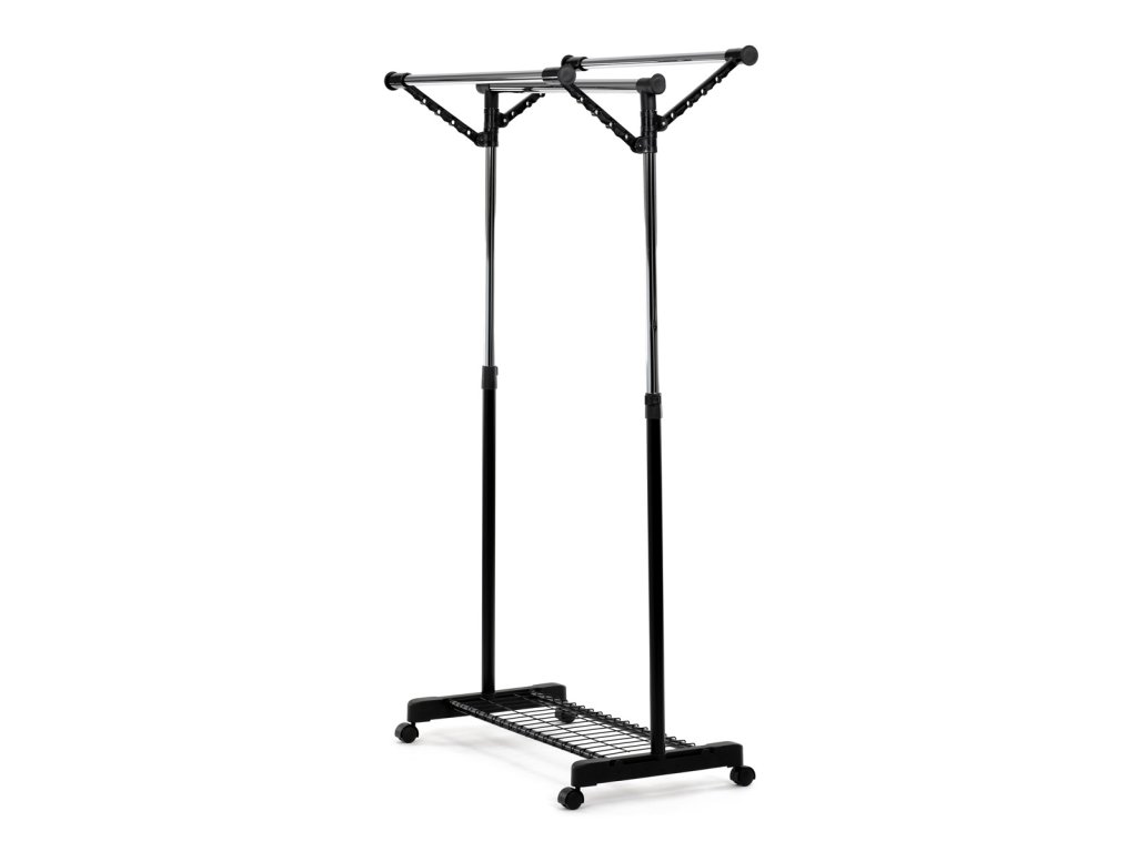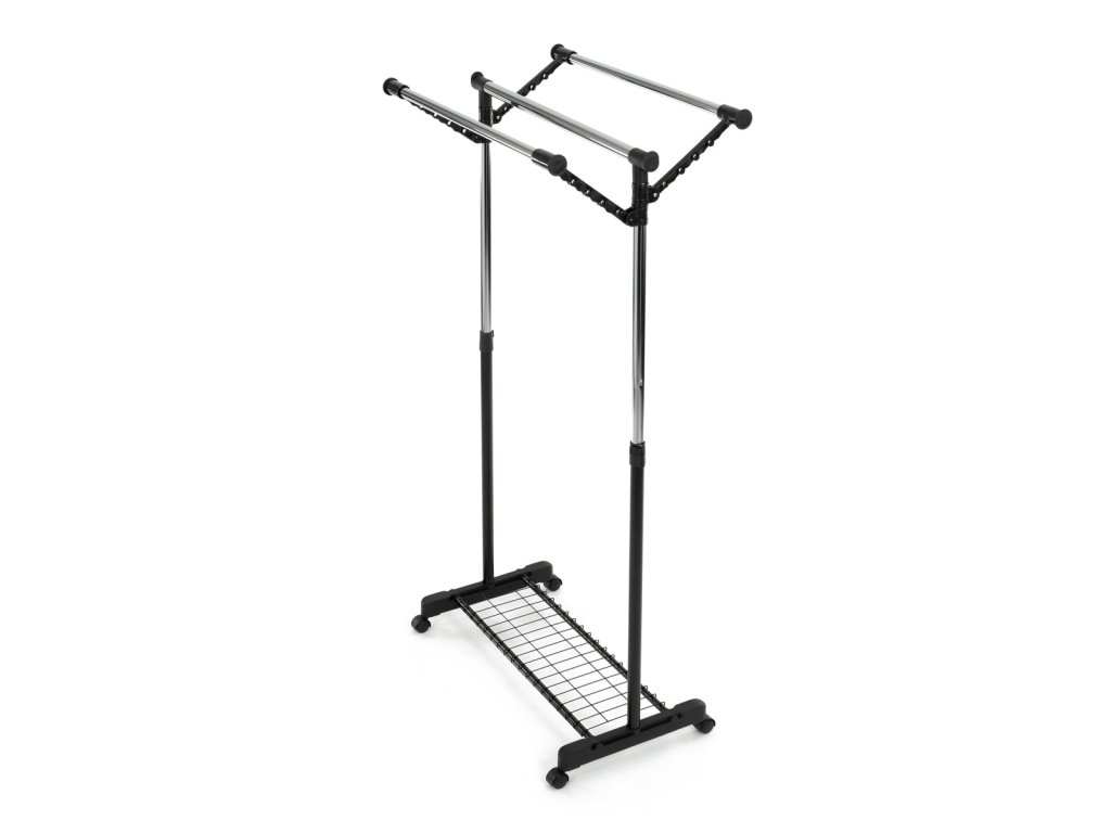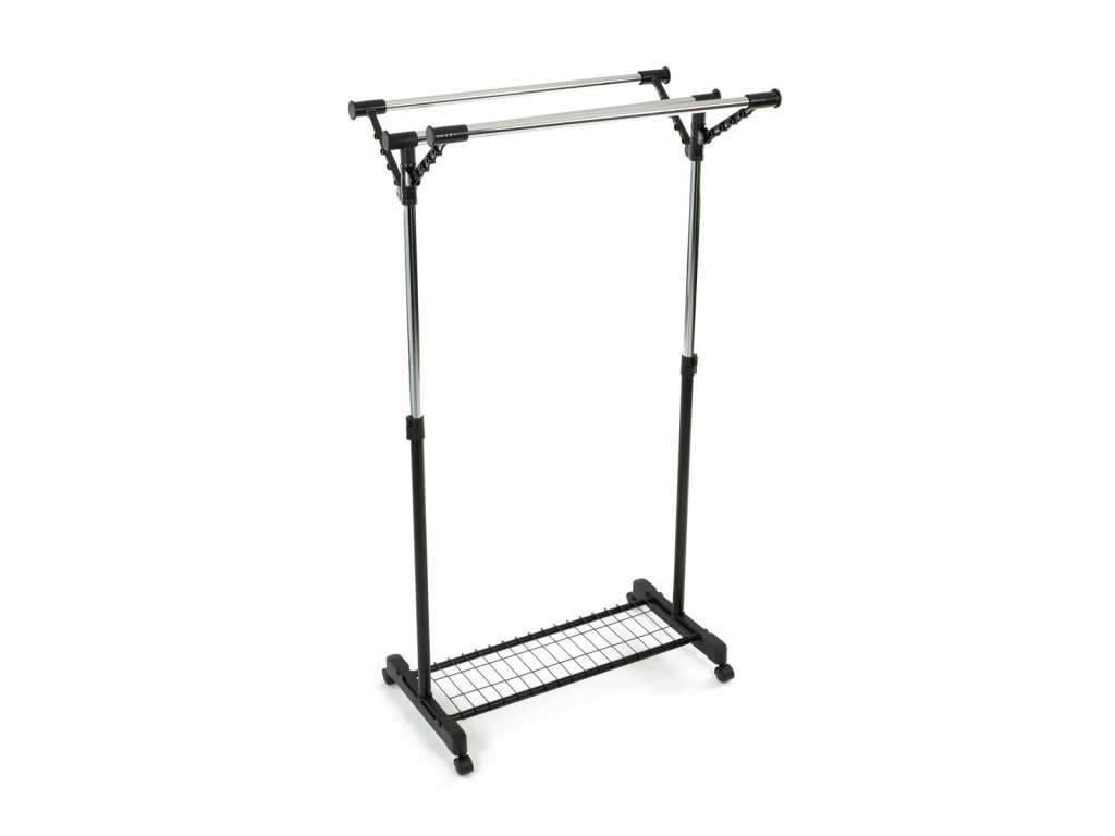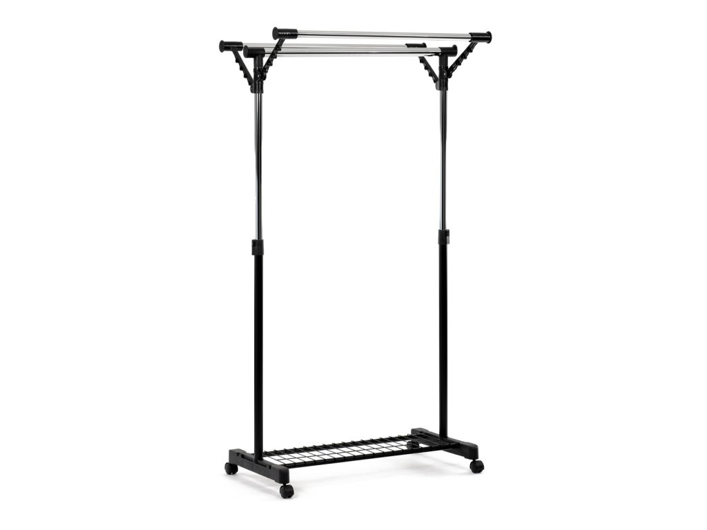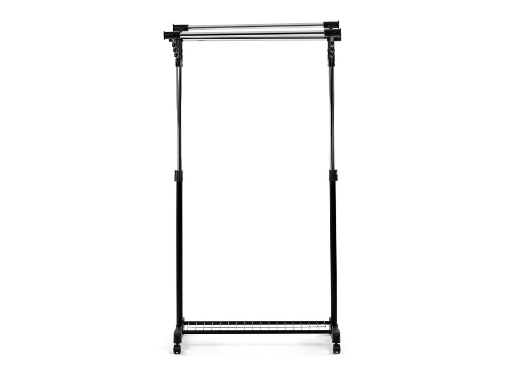 Dvojitá tyč poskytuje dostatek prostoru pro zavěšení oblečení, zatímco kolečka zajišťují snadnou manipulaci.