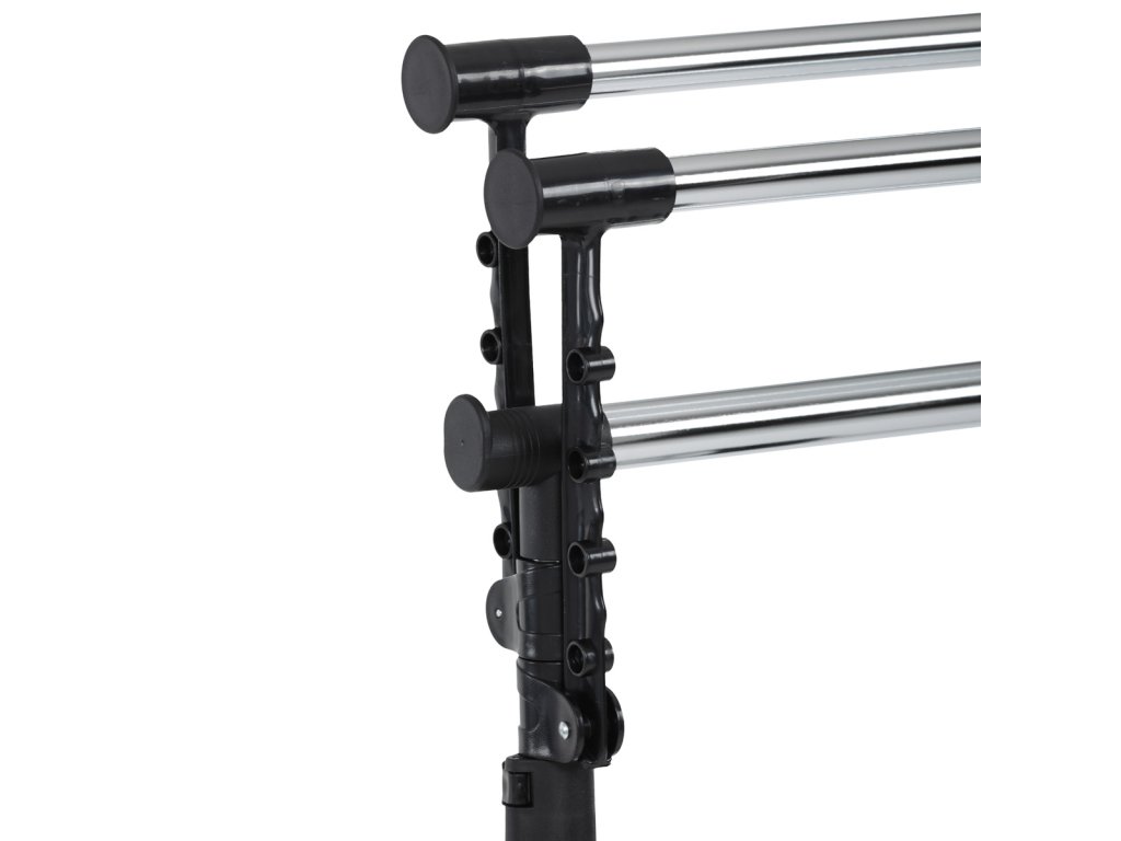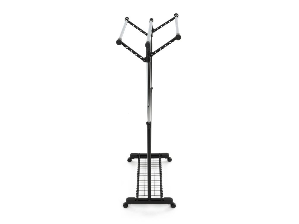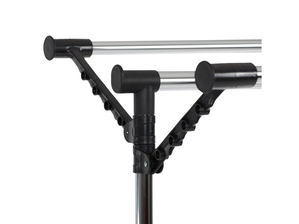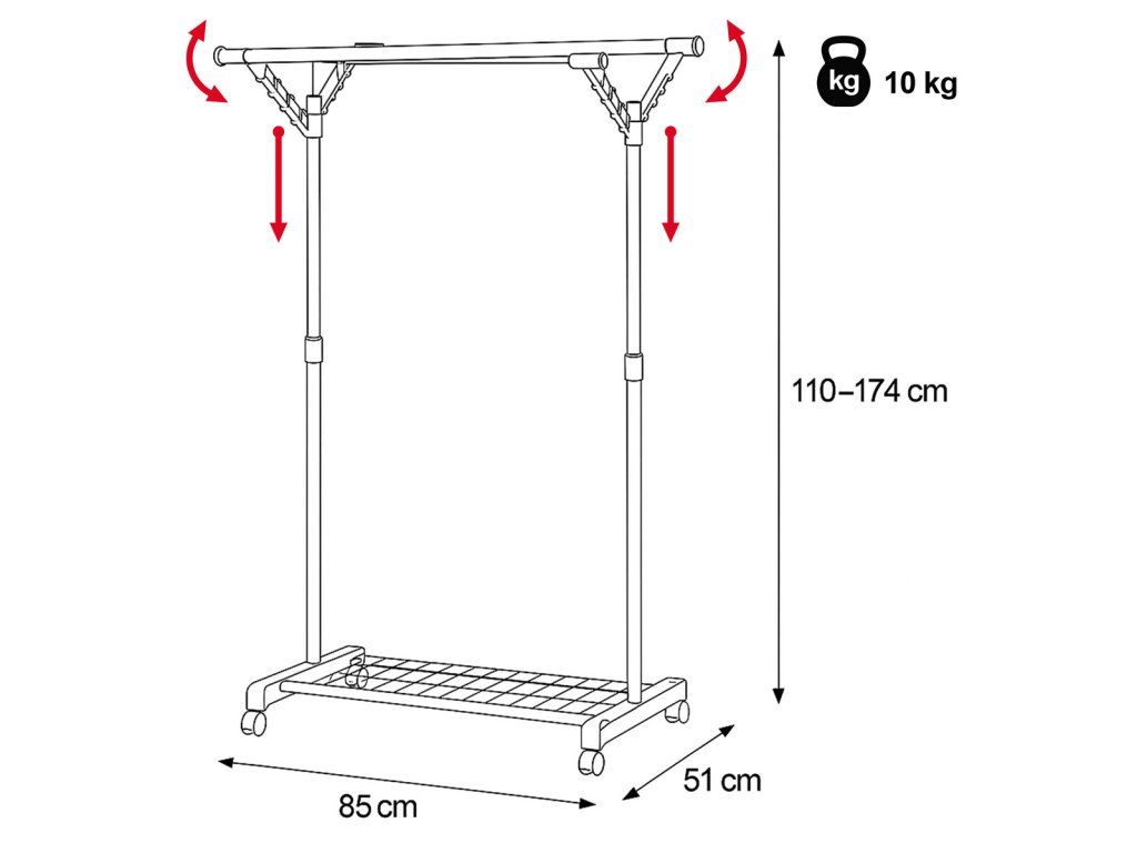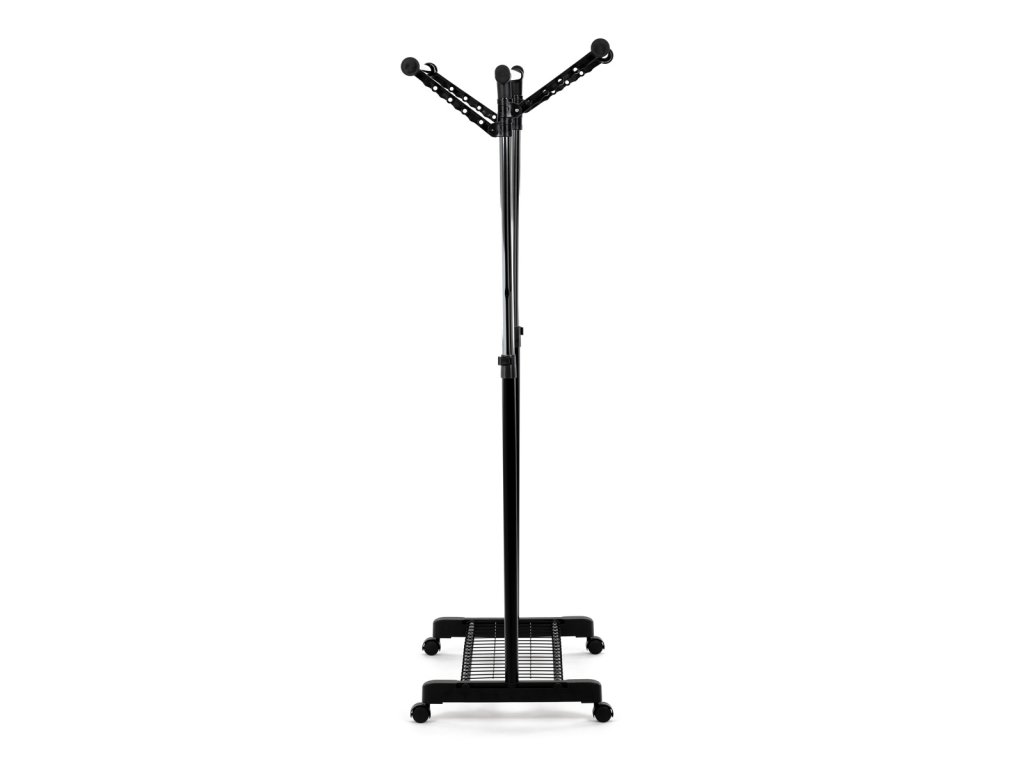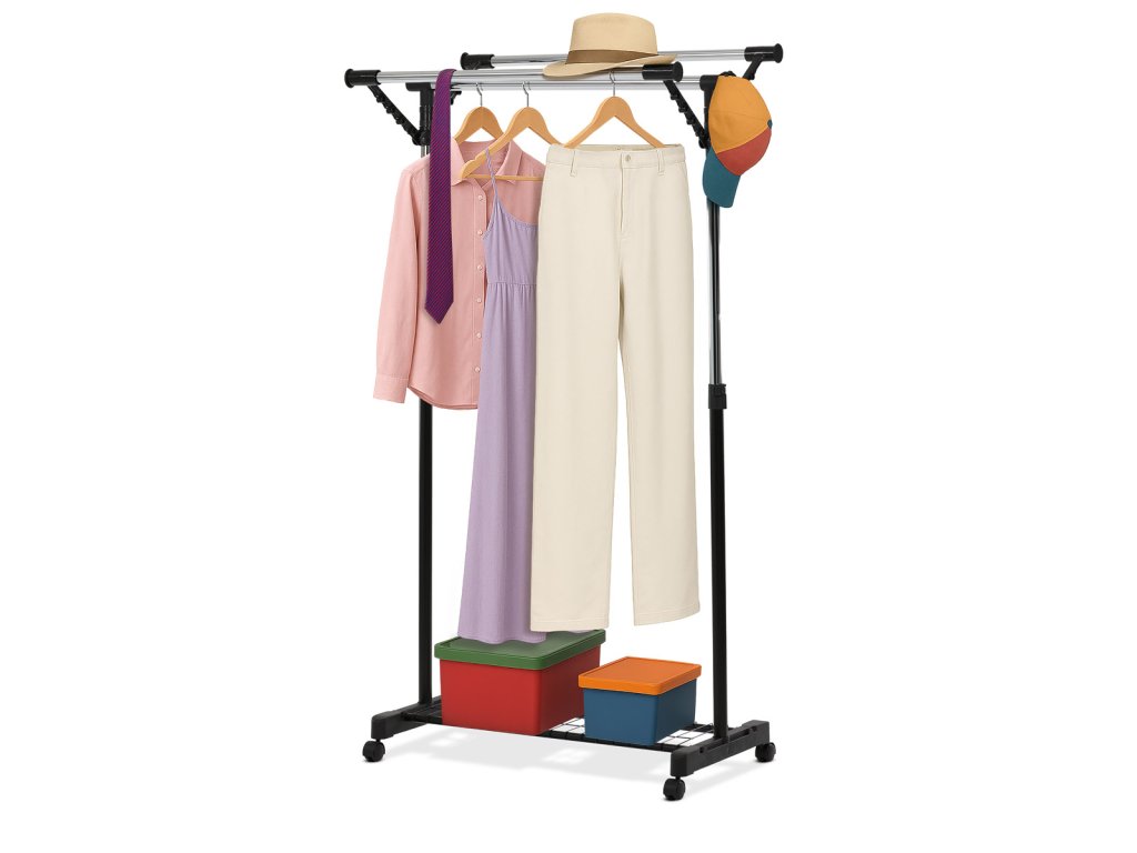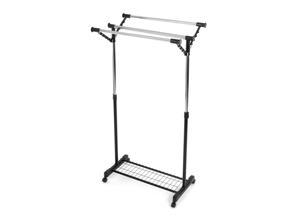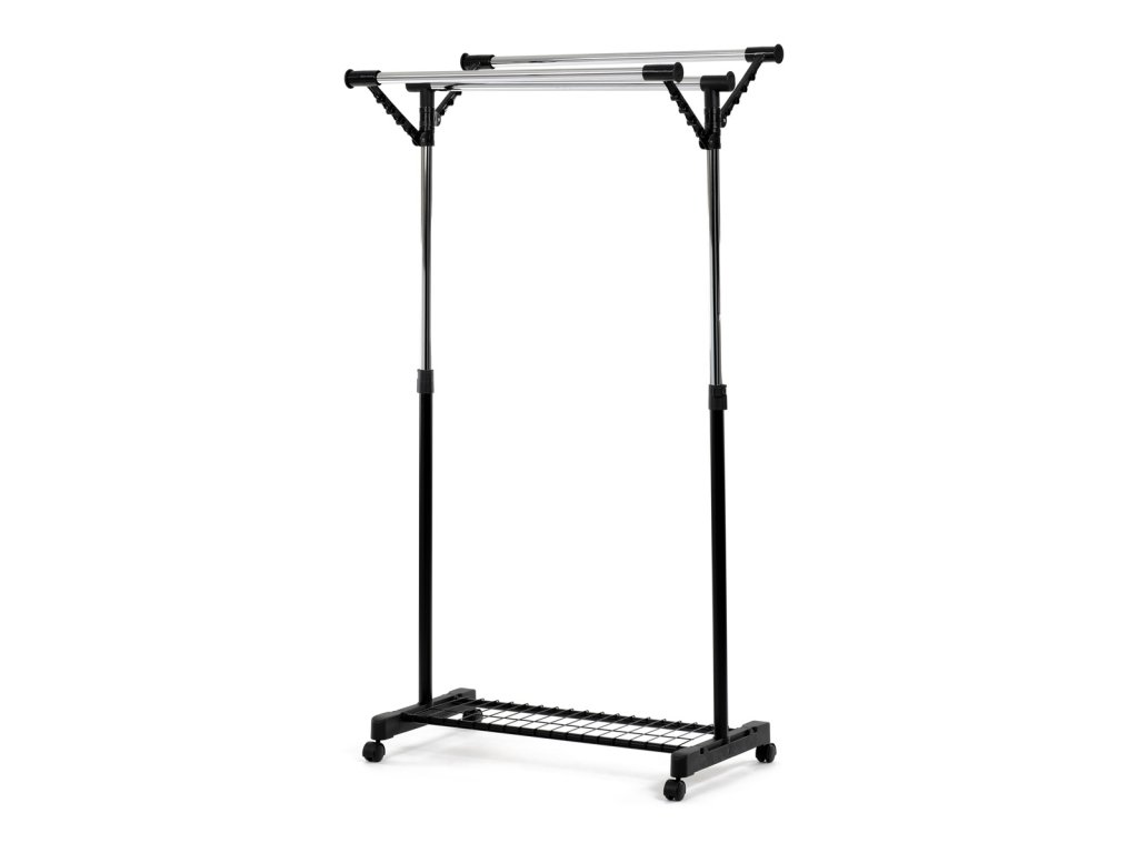 Dvojitá tyč poskytuje dostatek prostoru pro zavěšení oblečení, zatímco kolečka zajišťují snadnou manipulaci.