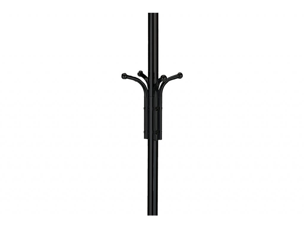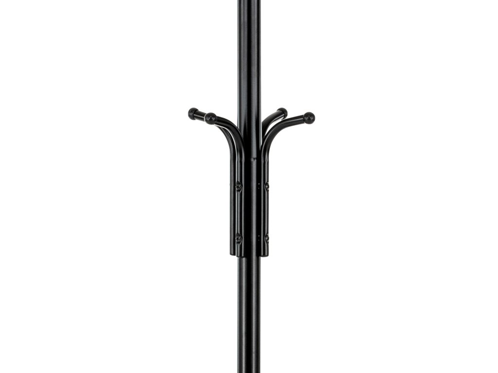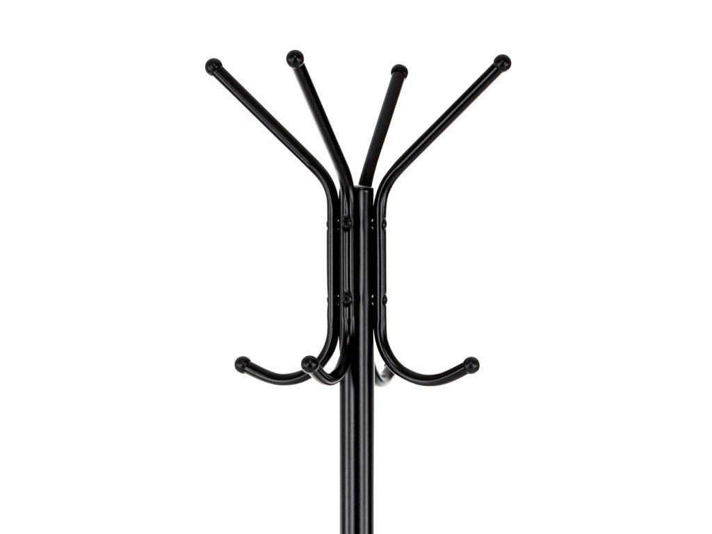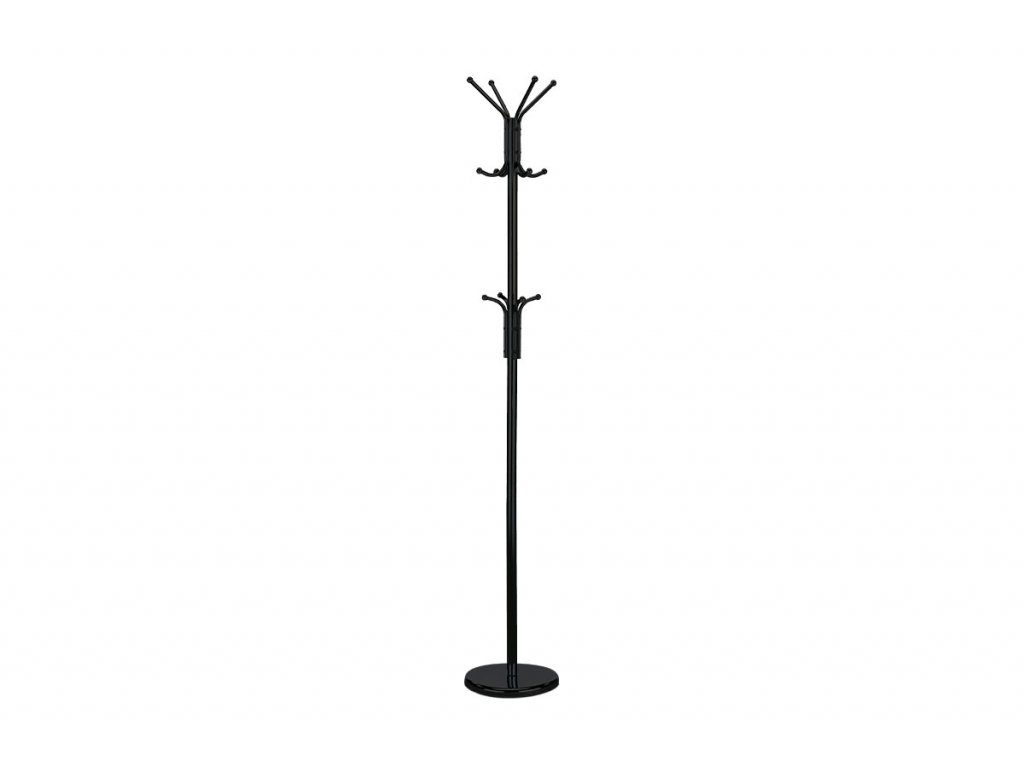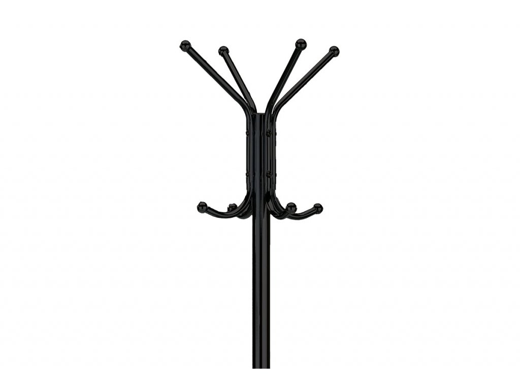 Klasický kovový stojanový věšák v povrchové úpravě černý matný lak a se závěsnými háčky ve dvou výškových úrovních.