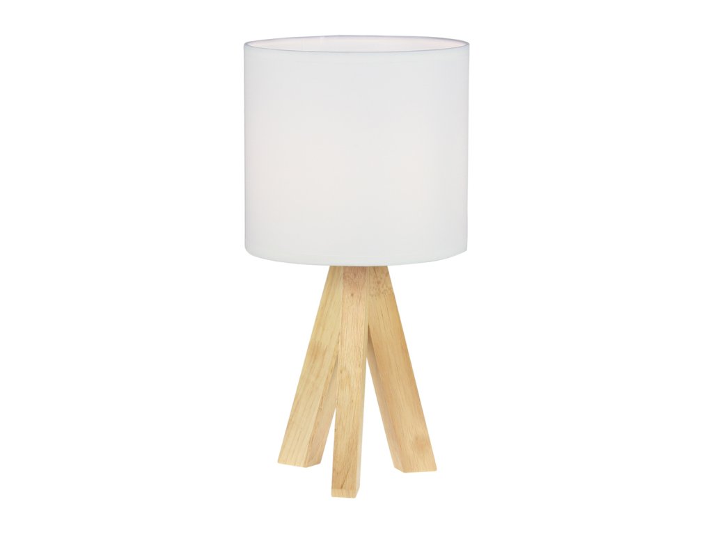 Stolní lampa s elegantní dřevěnou podstavou a bílým stínidlem, které vytváří jemné a příjemné osvětlení.