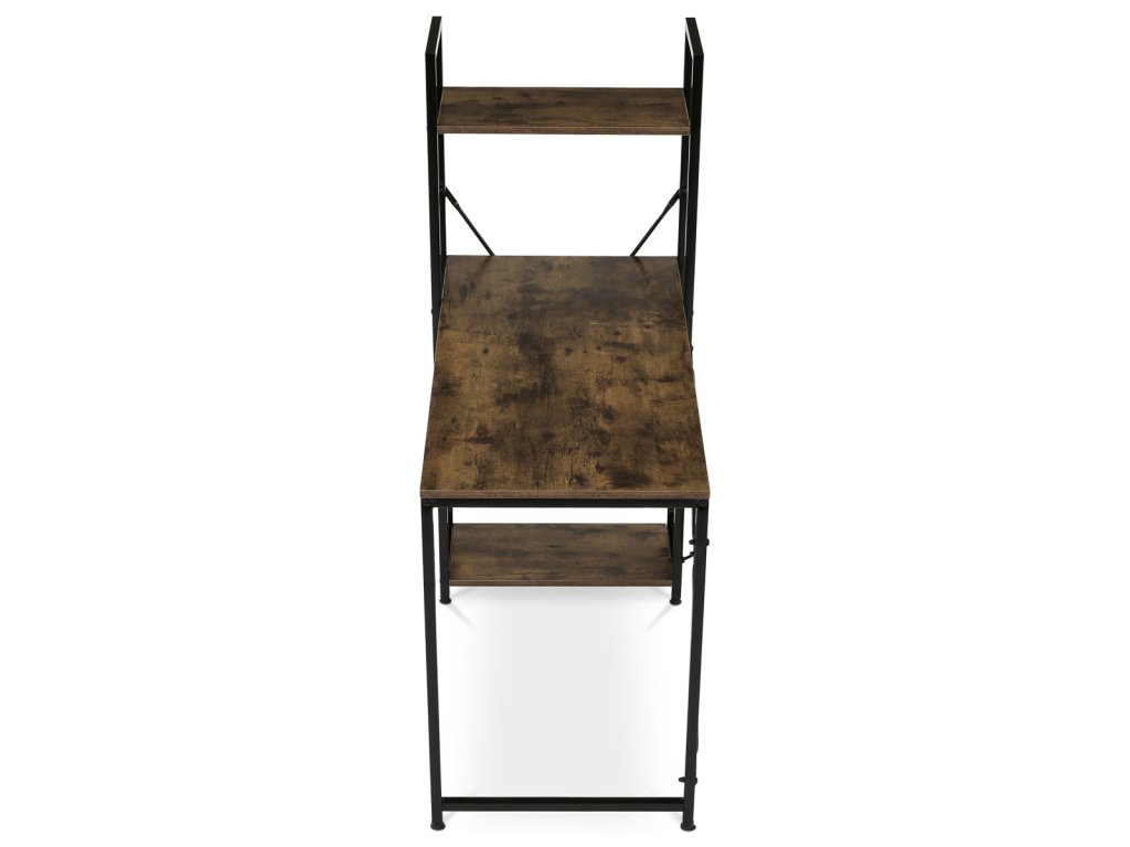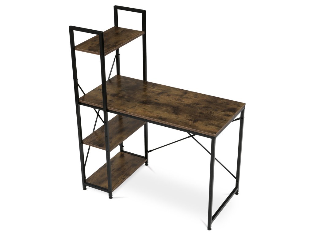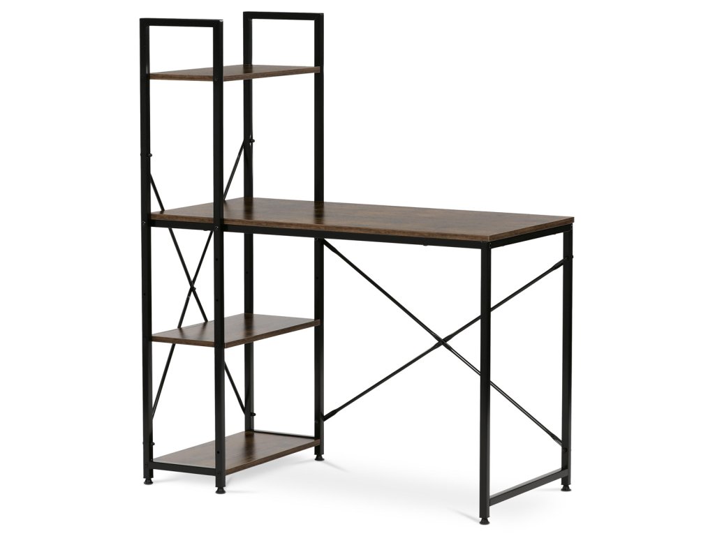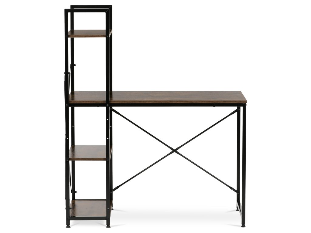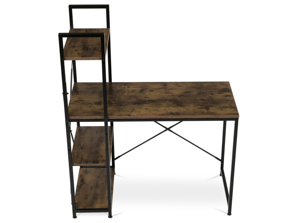 Praktický pracovní stůl v dekoru starého dřeva s integrovaným regálem na levé straně.