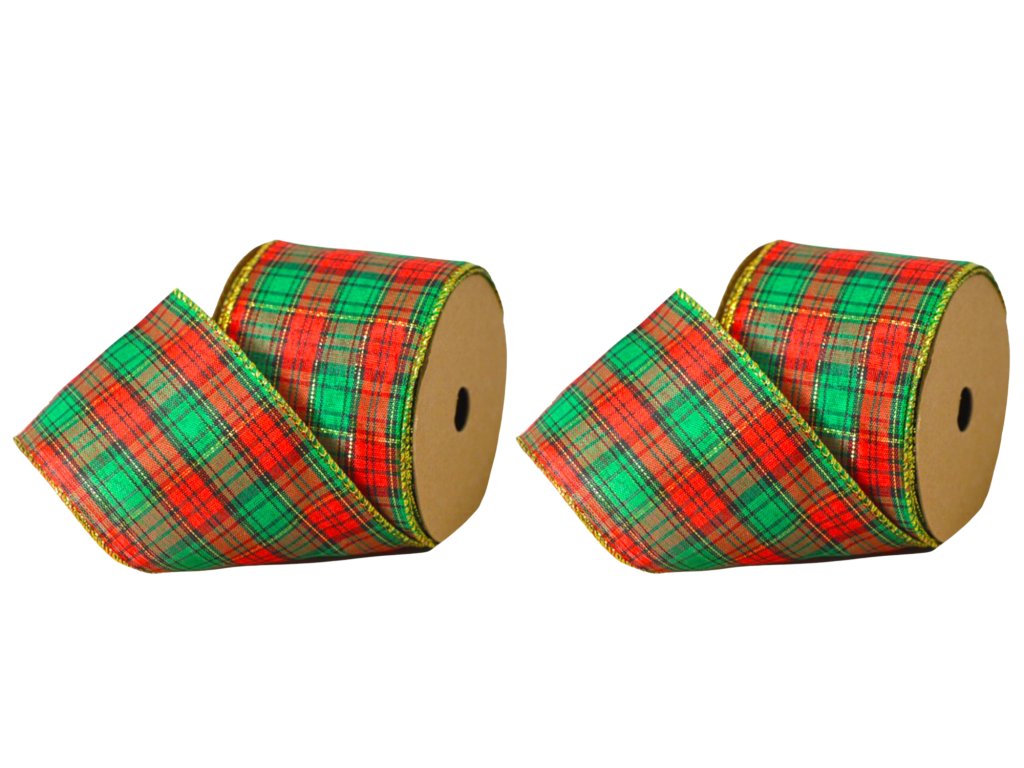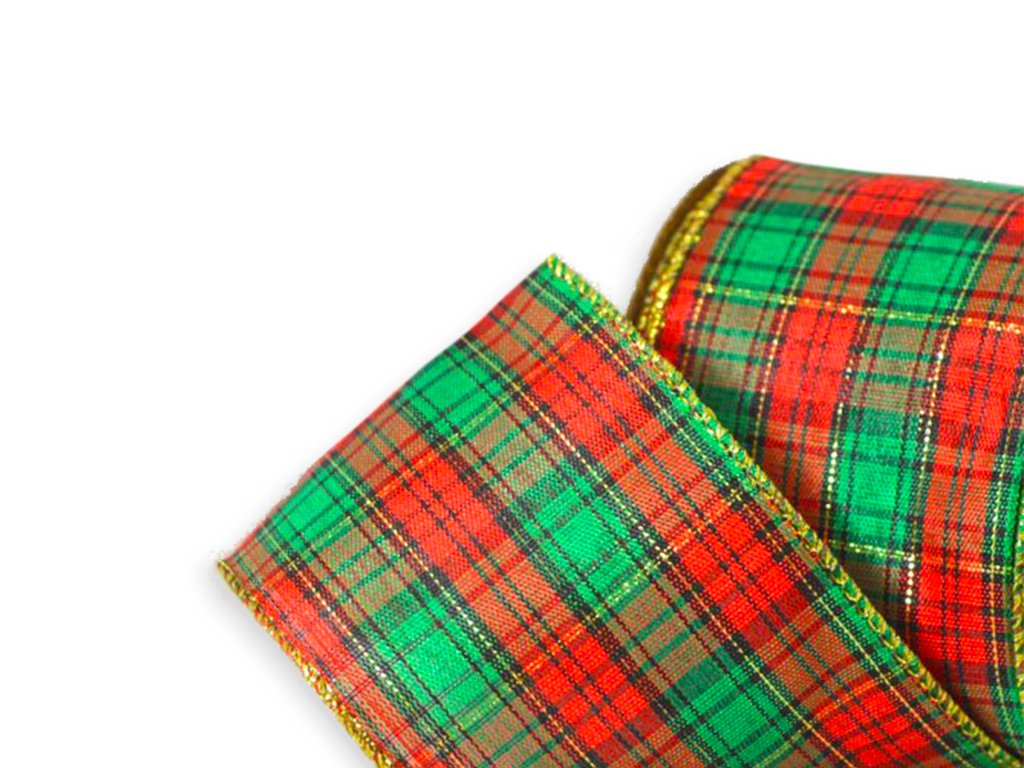 Dekorační stuhy v červeno-zelené barvě s kostkovaným vzorem a zlatým okrajem pro vánoční výzdobu.