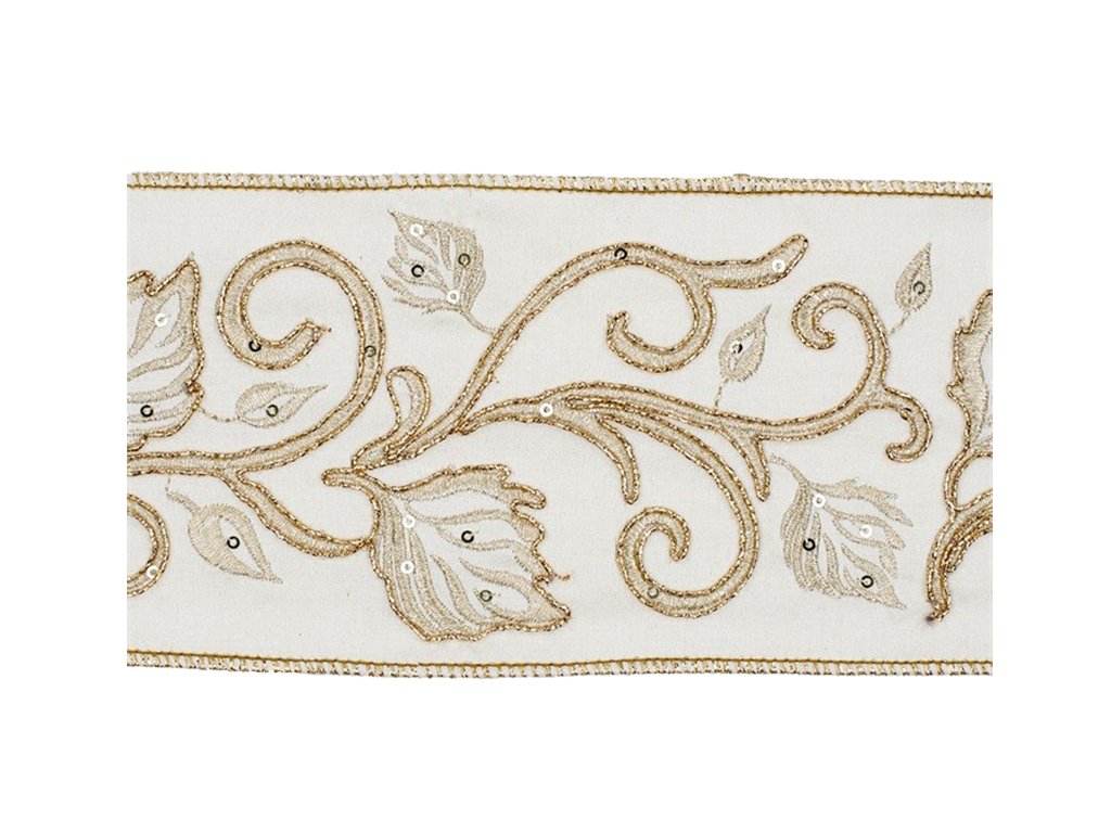 Dekorační stuha s v krémové barvě s vyšívaným dekorem, skvěle tvarovatelná.