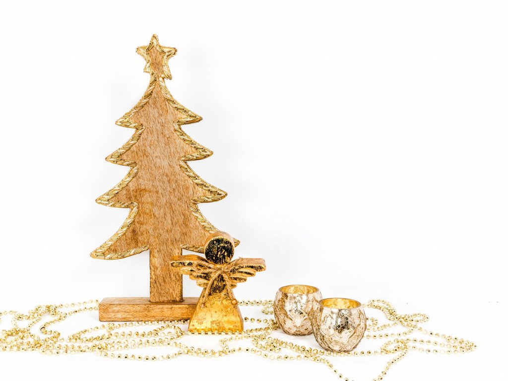 Sada 4 ks dekorací: Stromek se zlatým lemem, andělíček, svícny