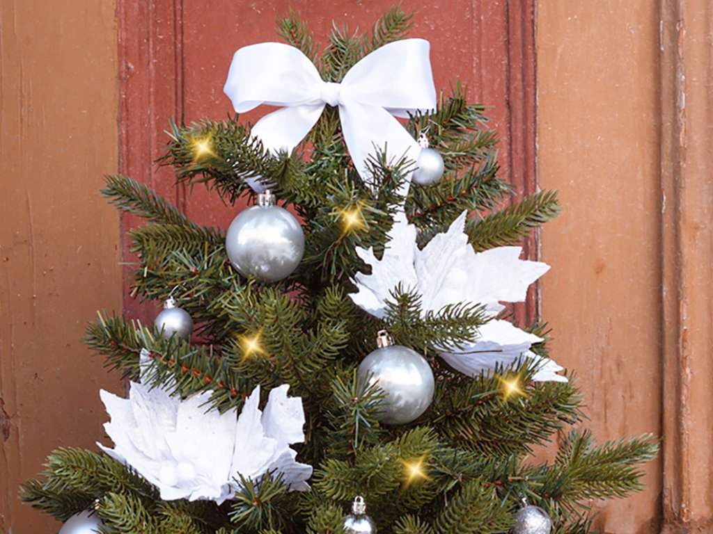 Umělý vánoční stromek je ozdoben jemnou kombinací bílých květů a stříbrných ozdob, které podtrhují zimní období zasněžených Vánoc.