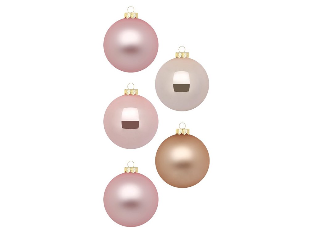 Skleněné ozdoby v jemných odstínech krémové a růžové barvy.