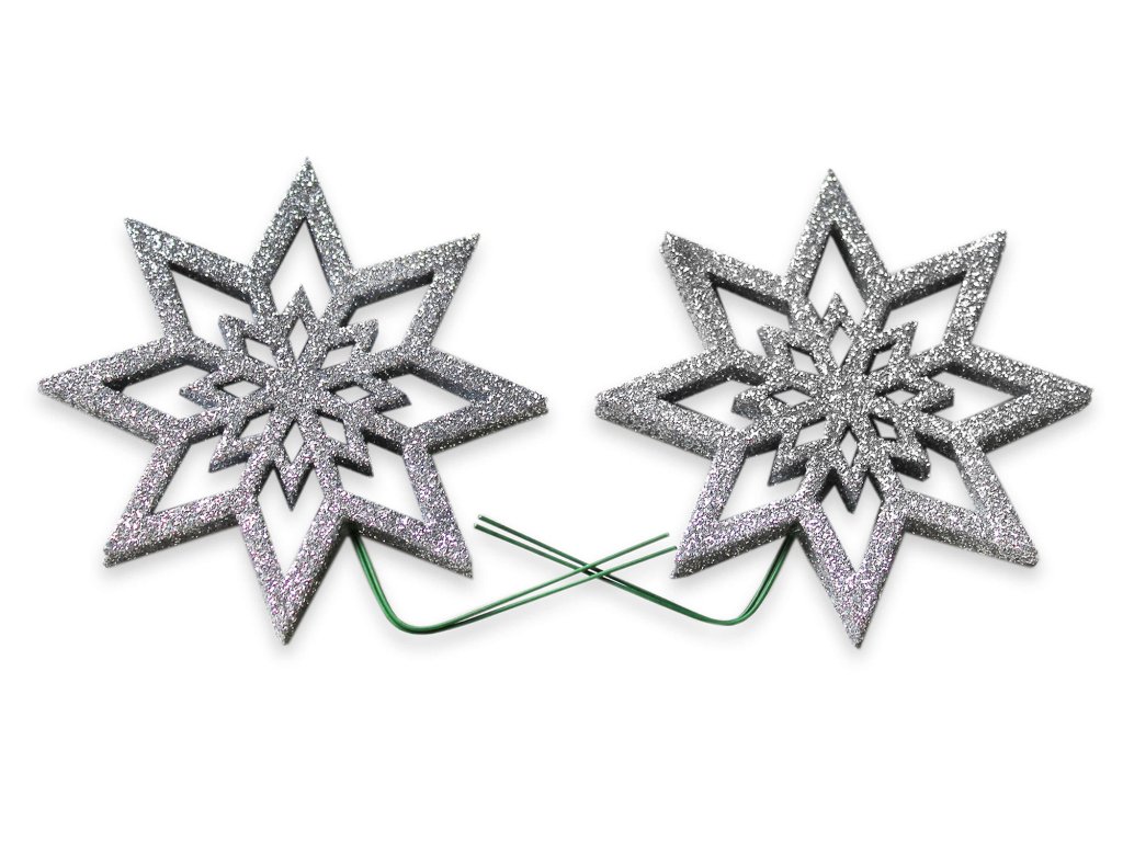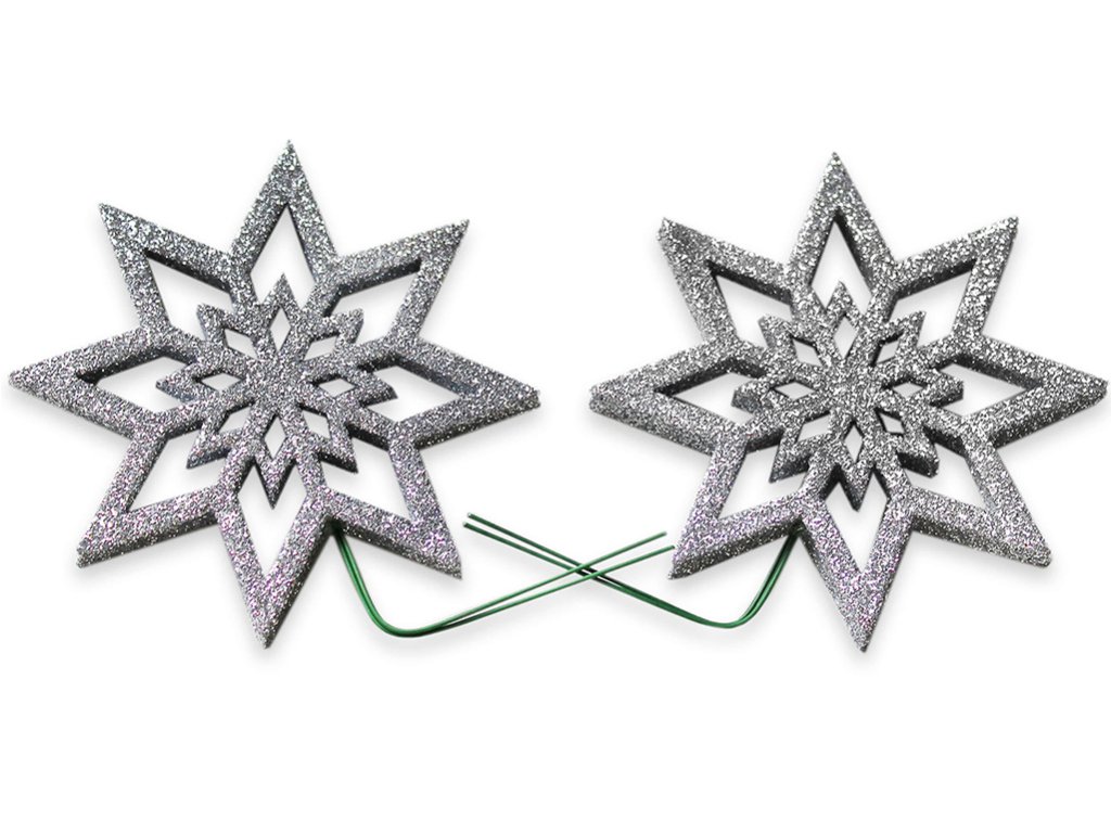 Sada 2 ks dekorací v podobě hvězdiček s glitry v barvě stříbrné.