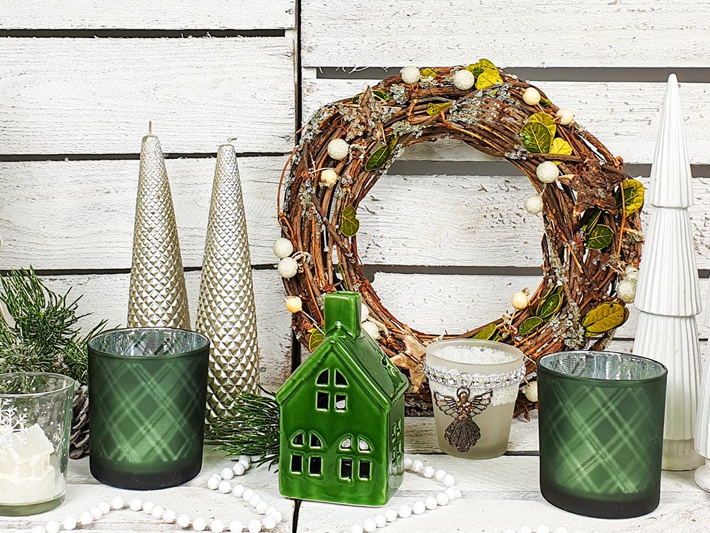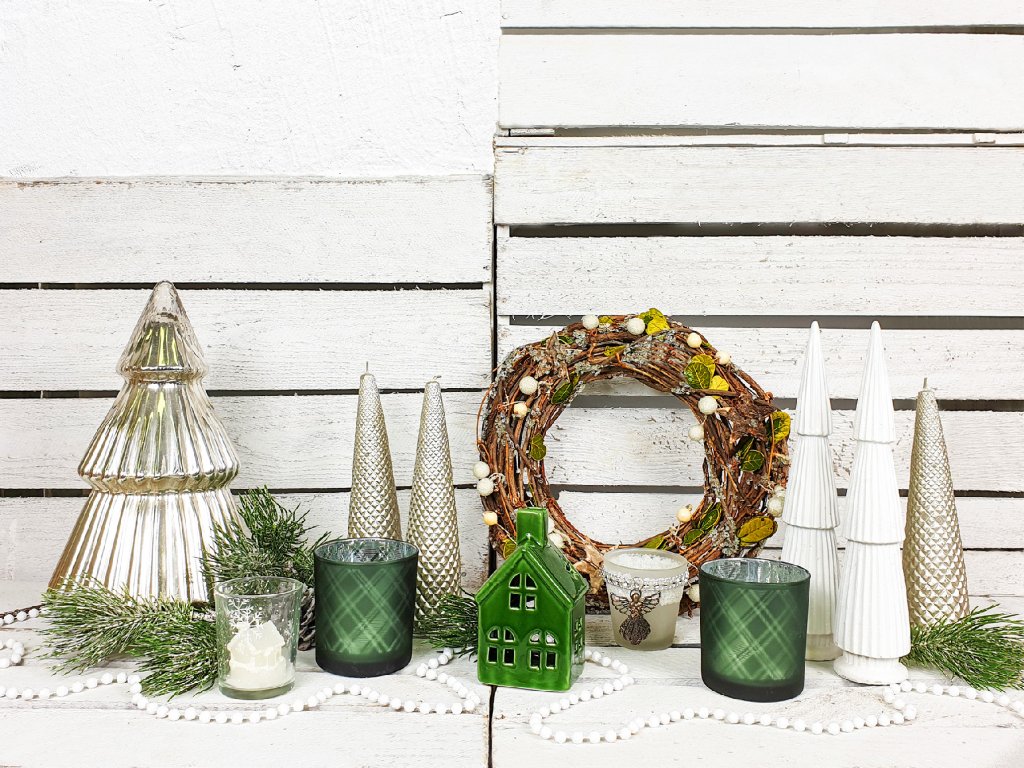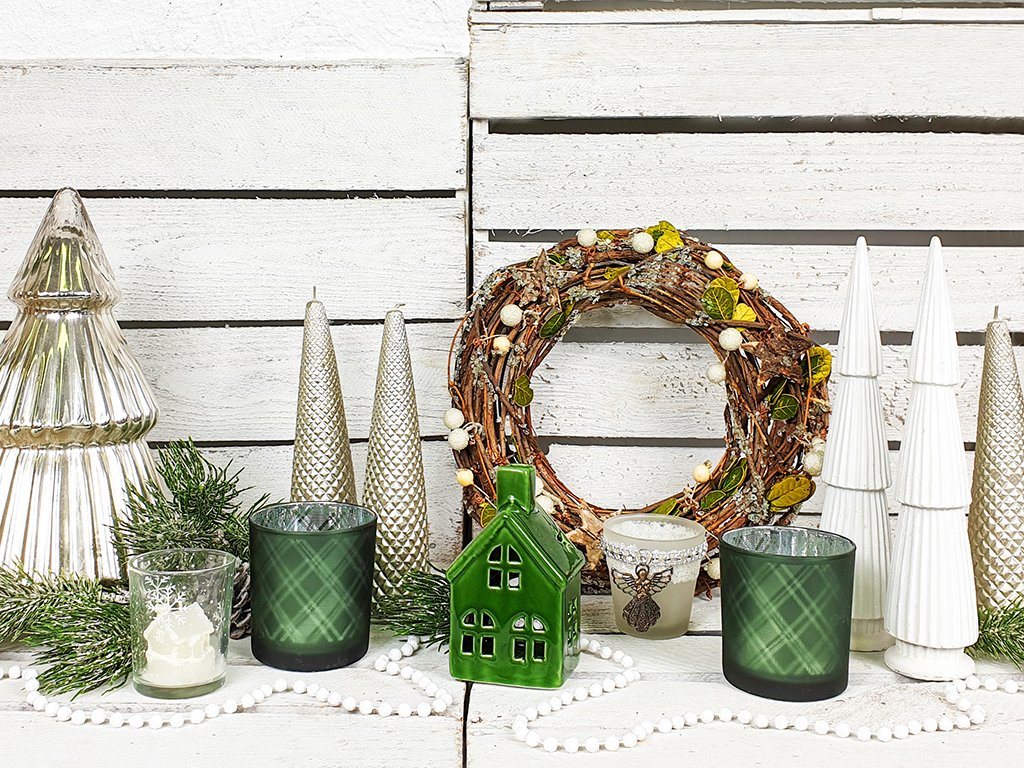 Pocit útulna skvěle vytvoří malé dekorace v podobě bohatě zdobeného věnce a ozdobných stromečků, díky kterým budete mít Vánoce ještě raději.