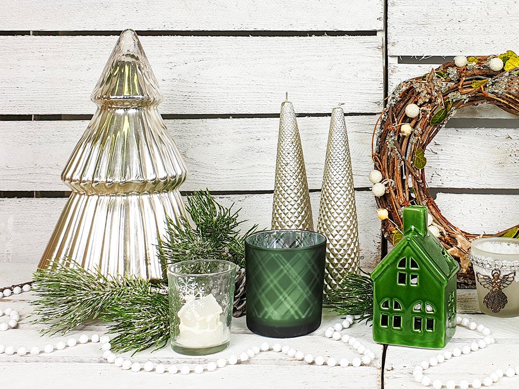 2x svícen na svíčku s dekorem kostek, barva zelená, vnitřní strana lesklá stříbrná, materiál sklo