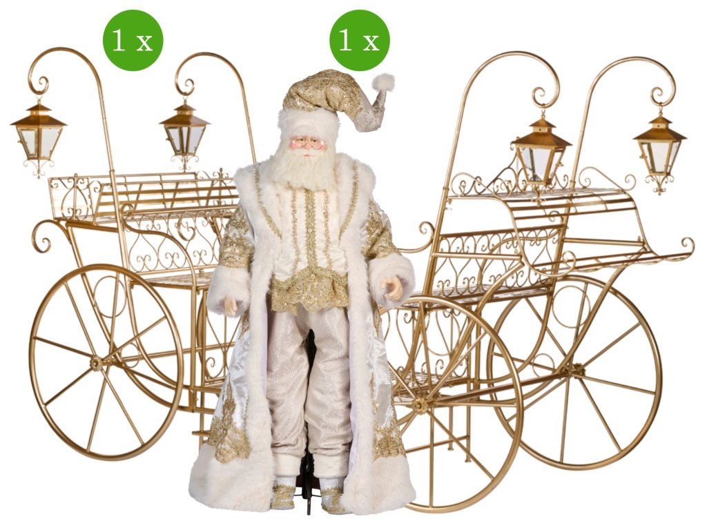 S touto luxusní sadou Santa s kočárem zlatá životní velikost přeměníte Váš prostor v kouzelnou vánoční scénu, která zanechá nezapomenutelný dojem na všechny, kdo ji spatří.