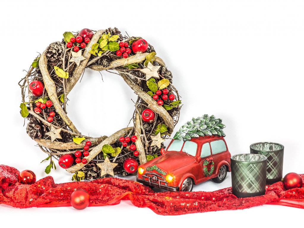 Sada 5 ks dekorací: Svítící autíčko, věnec, svícny, dekorační látka