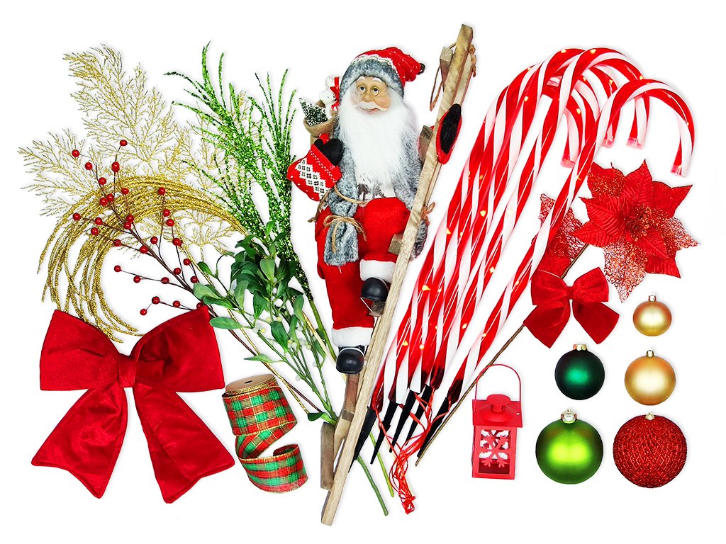 Obsahuje pestrou paletu vánočních symbolů a dekorací např.: dekorační větvičky, stuhy, světelné cukrové hůlky.