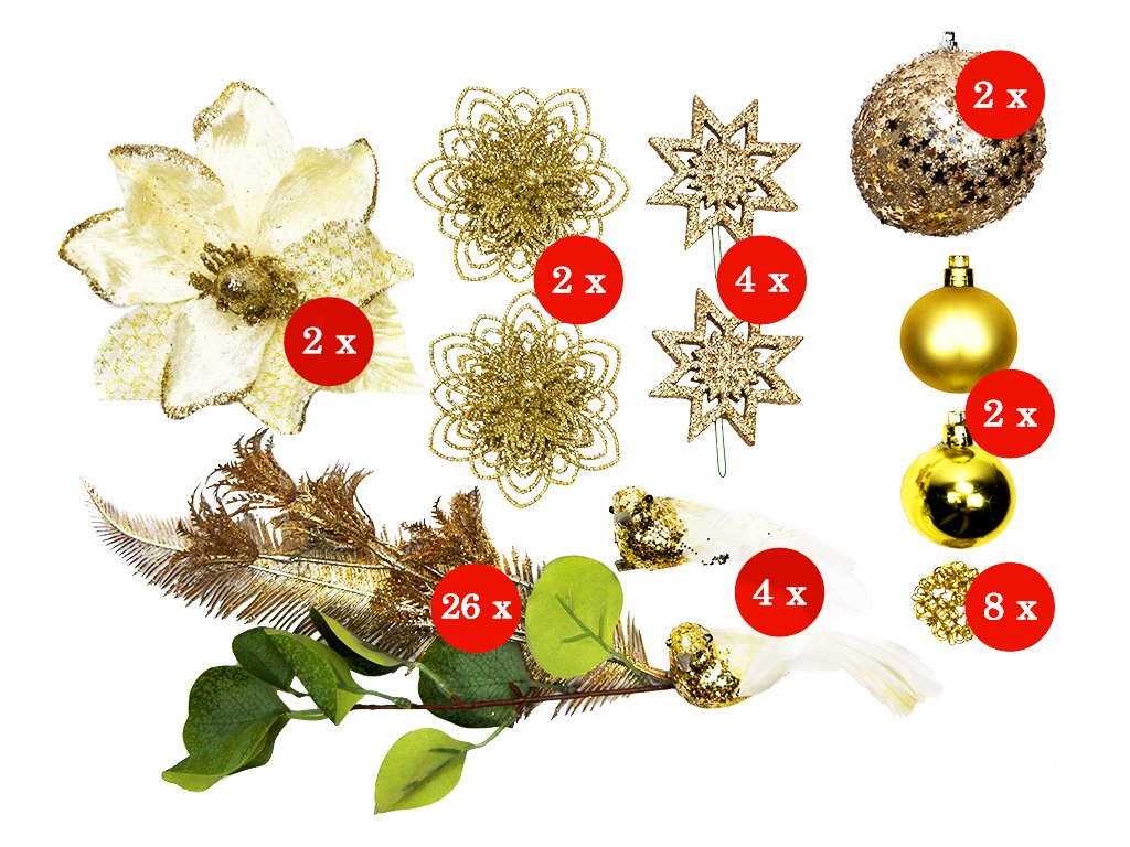 | Barva vánočních ozdob: | bílá, champagne, zelená, zlatá |
