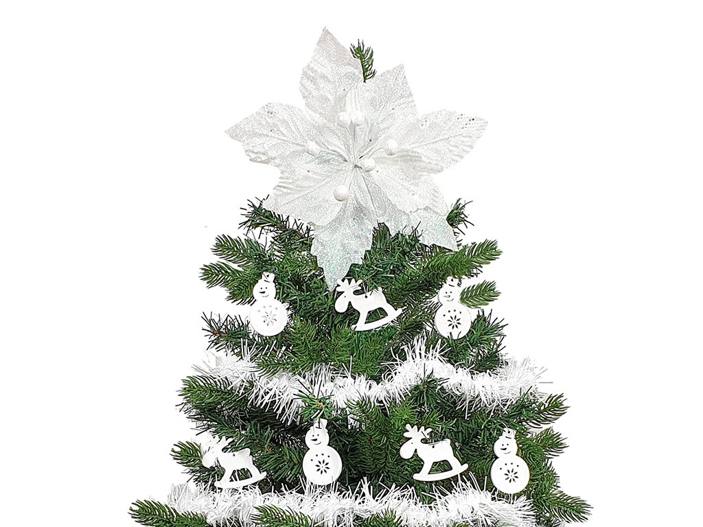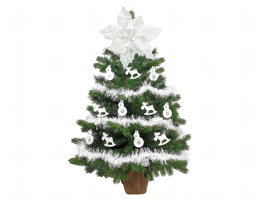 Dřevěné postavičky soba a sněhuláka, sněhově bílý řetěz a třpytivá květina na špičce stromečku dodávají stromečku skutečně kouzelný vzhled.