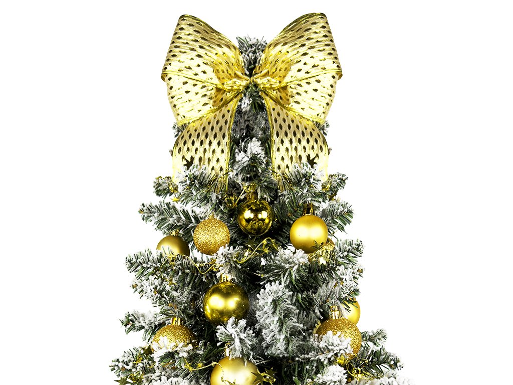 Zlatá mašle dodá stromku jemný a elegantní prvek, dokonale ladící s kulatými ozdobami.